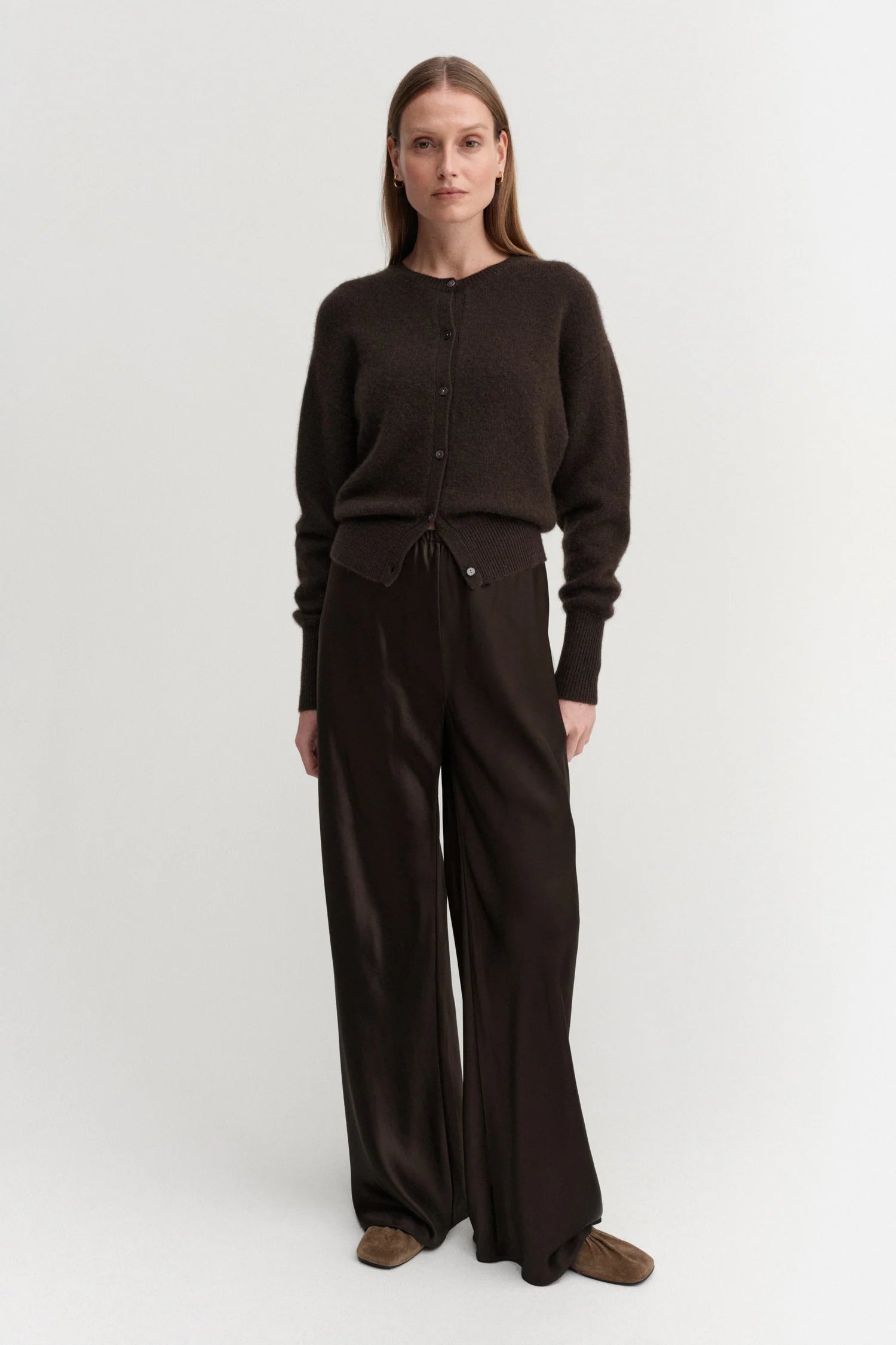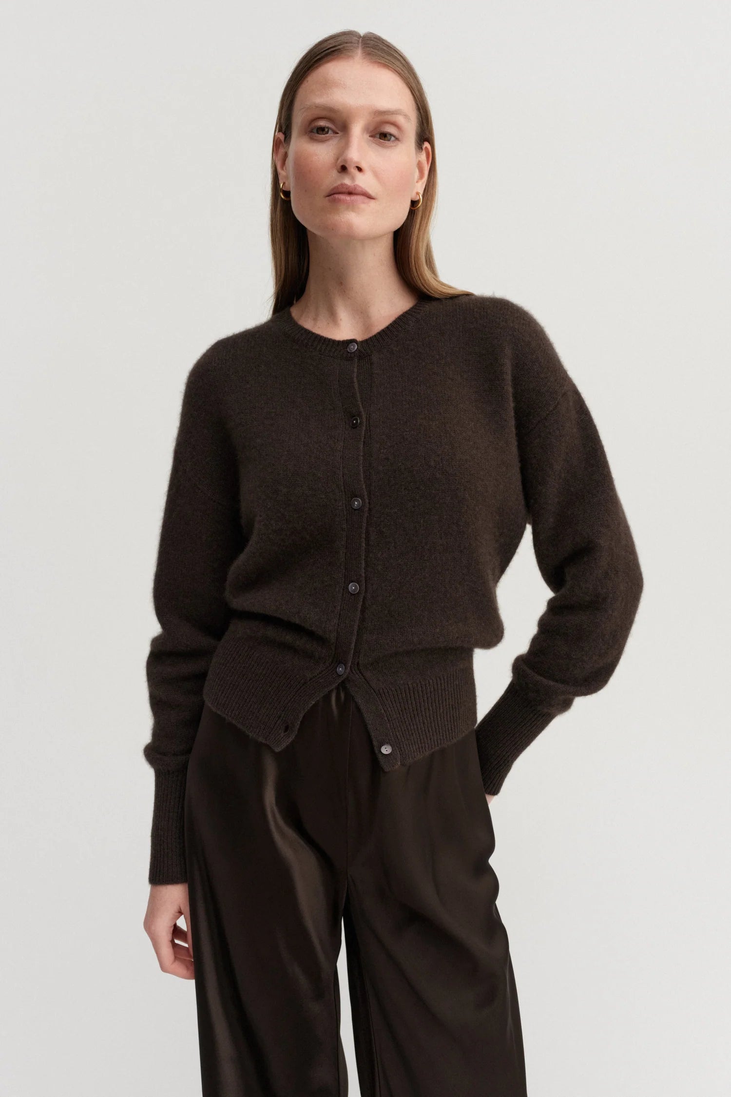 Coco Cardigan is knitted from super soft Mongolian cashmere that feels silky smooth against the skin and doesn't itch. The cardigan is designed for a slightly loose fit with a silhouette that sits tighter on the waist and end of the sleeves for easy roll up. It is featured with a classic crew neckline, dropped shoulders and fastens with shell buttons through the front. Rib-knitted detailing in collar, cuffs and hem.