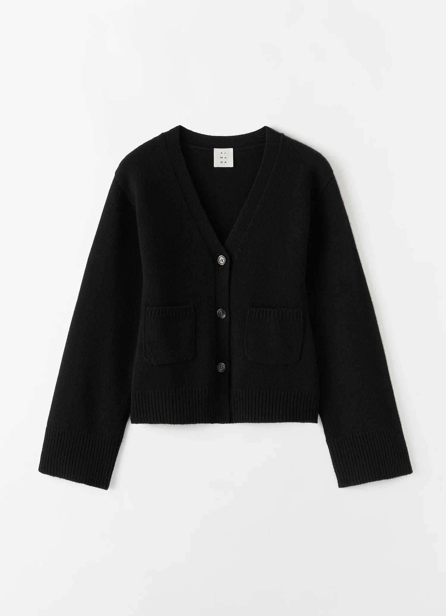 Drea Cardigan is knitted from a soft cashmere and merino wool blend, providing a smooth and itch-free feel against the skin. The cardigan is designed for a regular fit with a slightly cinched silhouette at the waist. It features a V-shaped neckline, dropped shoulders, ribbed trims, and front patch pockets.