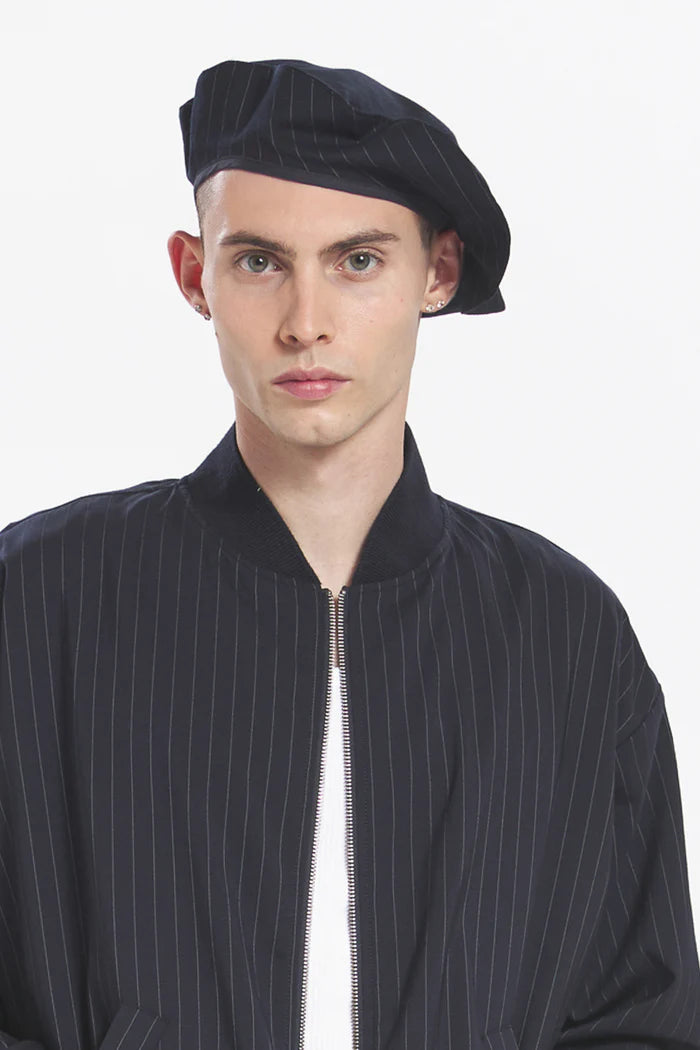 Inspired by Venetian nautical style, this beret is crafted in pinstripe tropical wool, blending maritime elegance with effortless comfort.