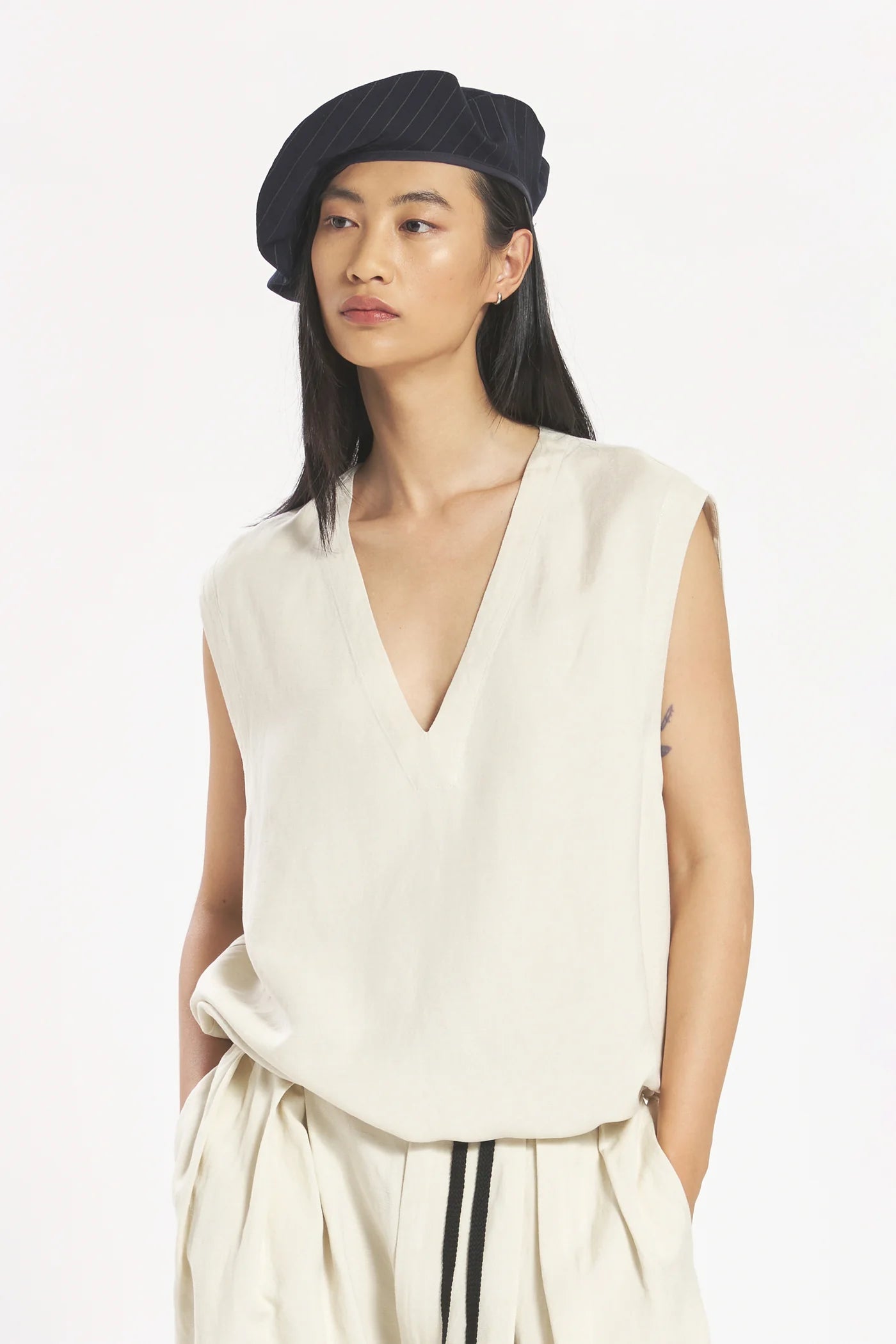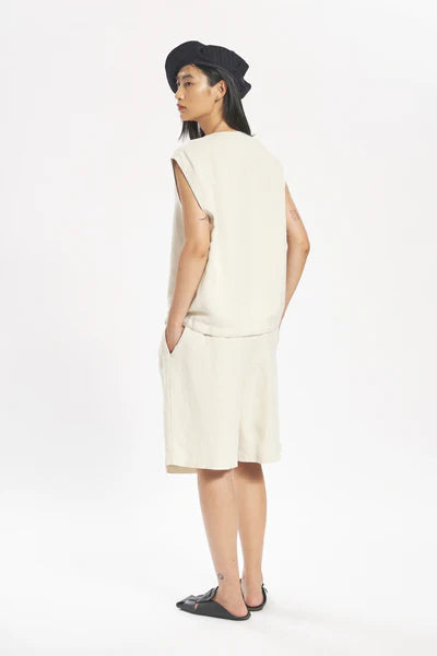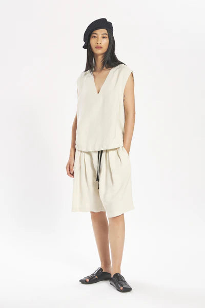 Light, fluid linen–viscose canvas shapes this relaxed V-neck sleeveless top, complete with an inner adjustable drawstring at the hem.