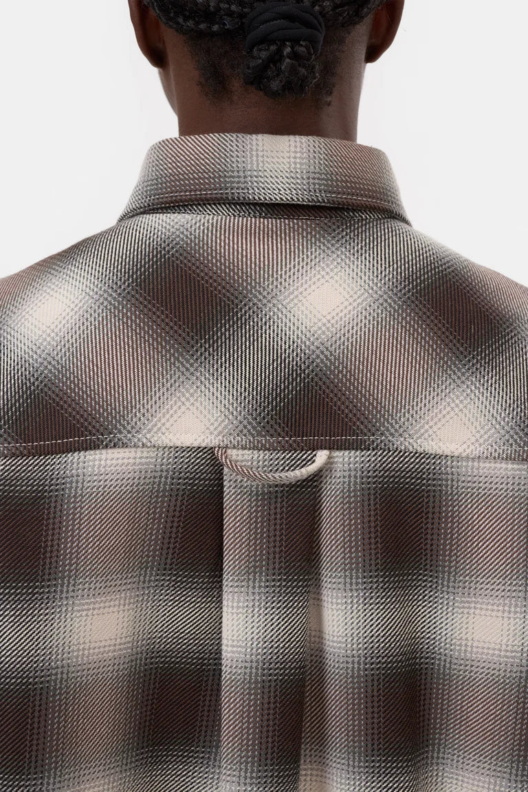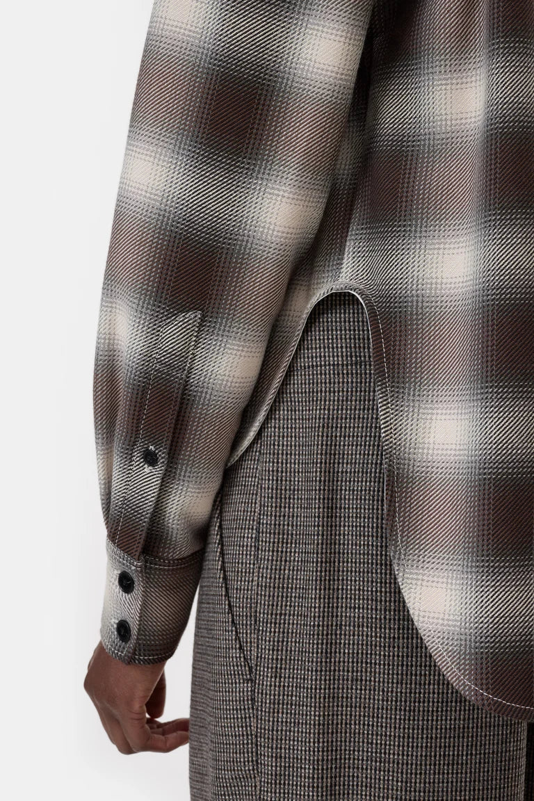 This cropped oversized shirt features a shadow check pattern. Made of cotton with a brushed interior, it includes a curved high-low hem, mother-of-pearl chest pockets, a pointed collar, and drop shoulders. Crafted in Portugal.