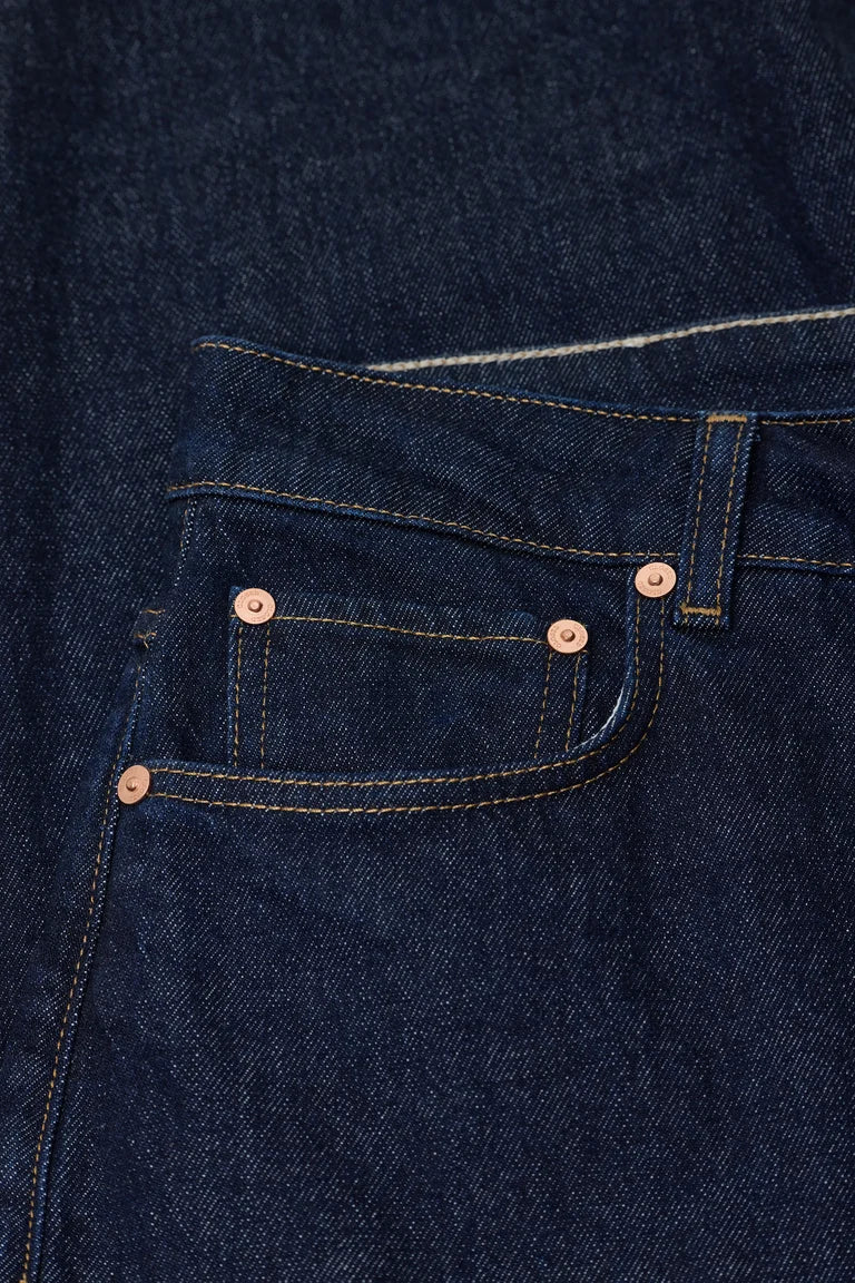 Our Jazzie Jeans stands out with its barrel cut, mid-rise waist, and ankle length. It features an even blue-black wash with a raw look, tobacco stitching, and copper details. Made in Italy.