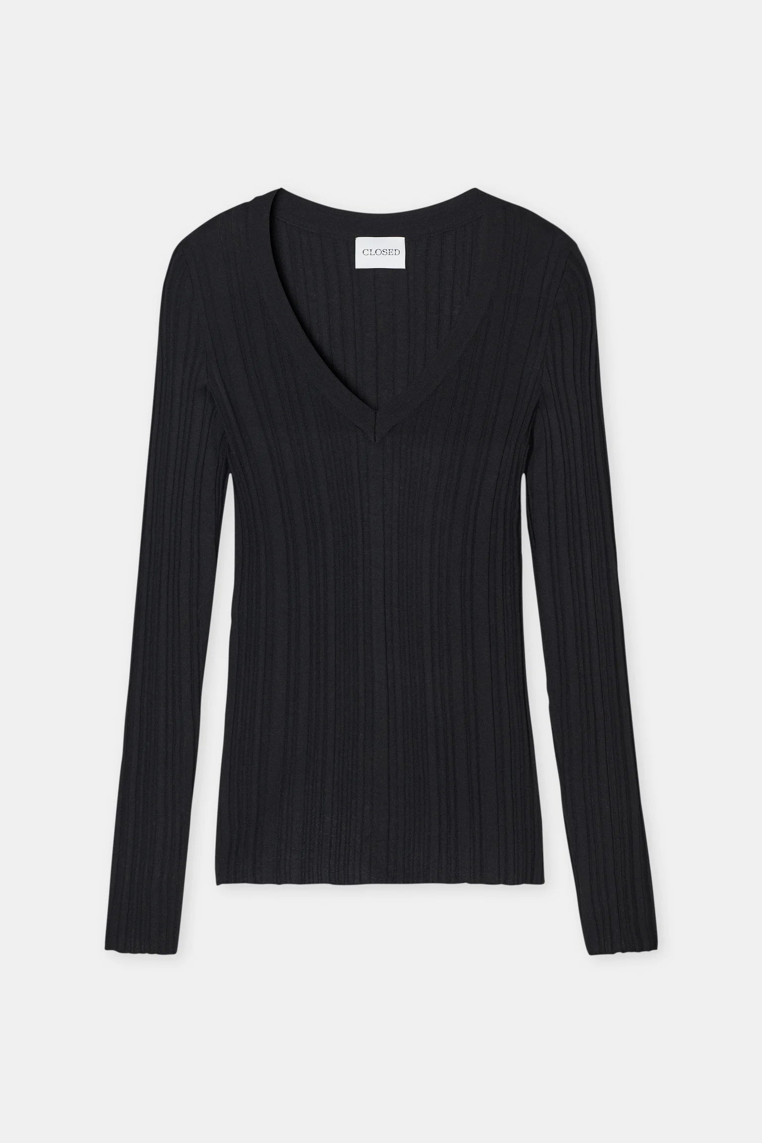 The slim V-neck long sleeve is crafted from a fine gauge blend of lyocell and merino wool. With a tailored fit, it offers softness and subtle shine. Knitted in an irregular flat rib pattern.
