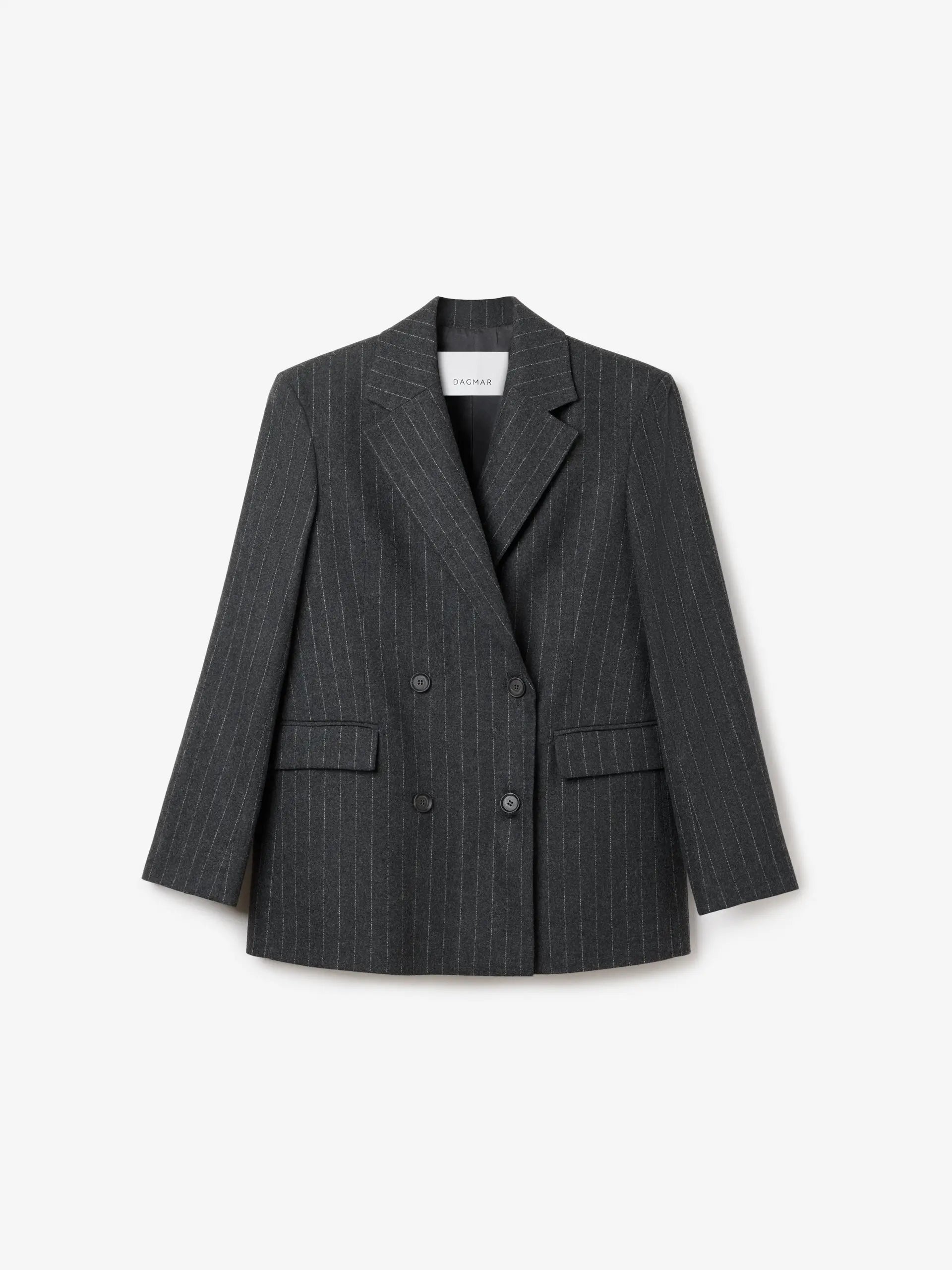 Tailored double-breasted blazer in Italian flannel wool suiting. A wardrobe icon, complete with a pinstripe pattern, notched lapels, flap pockets, and back vents. Fully lined