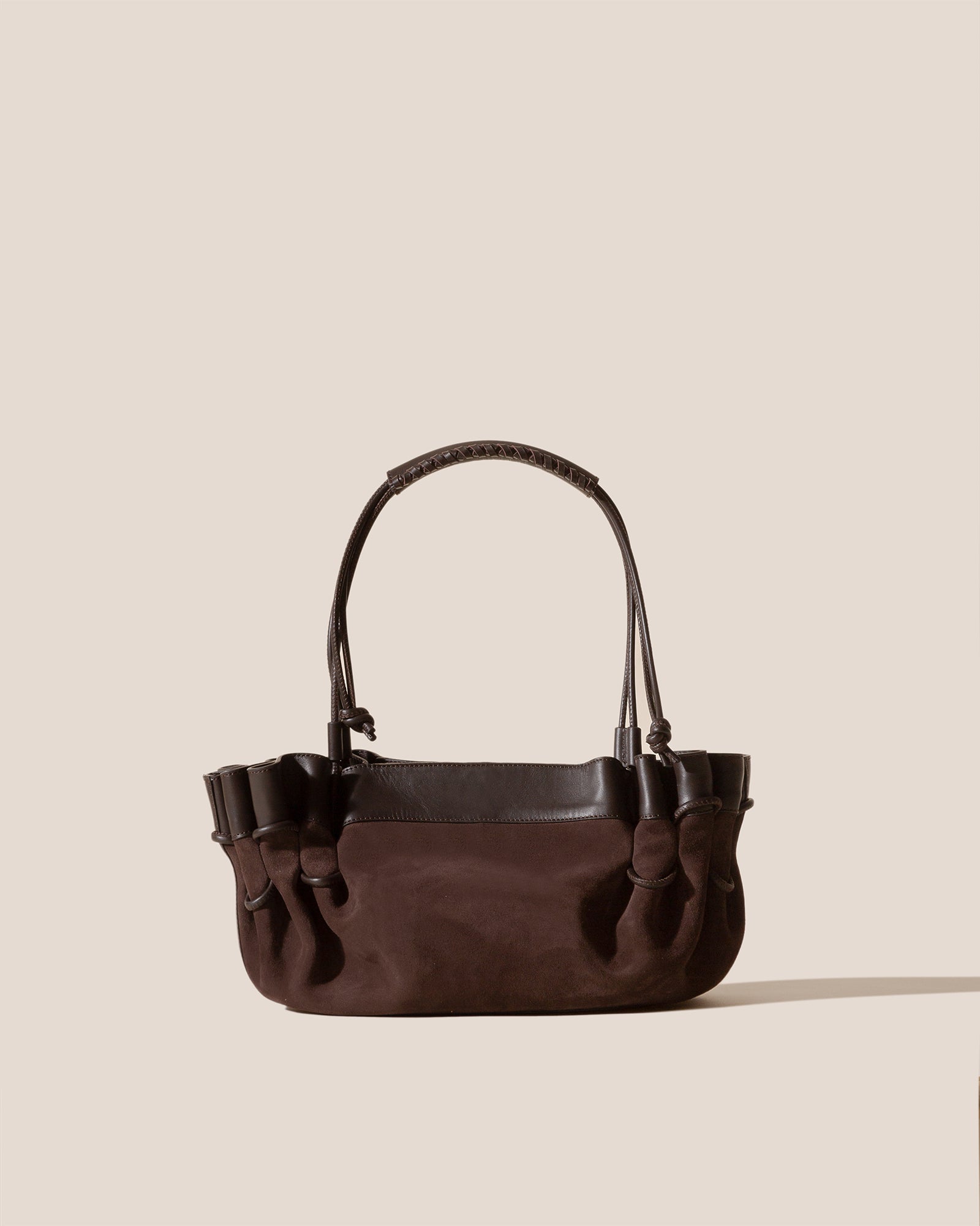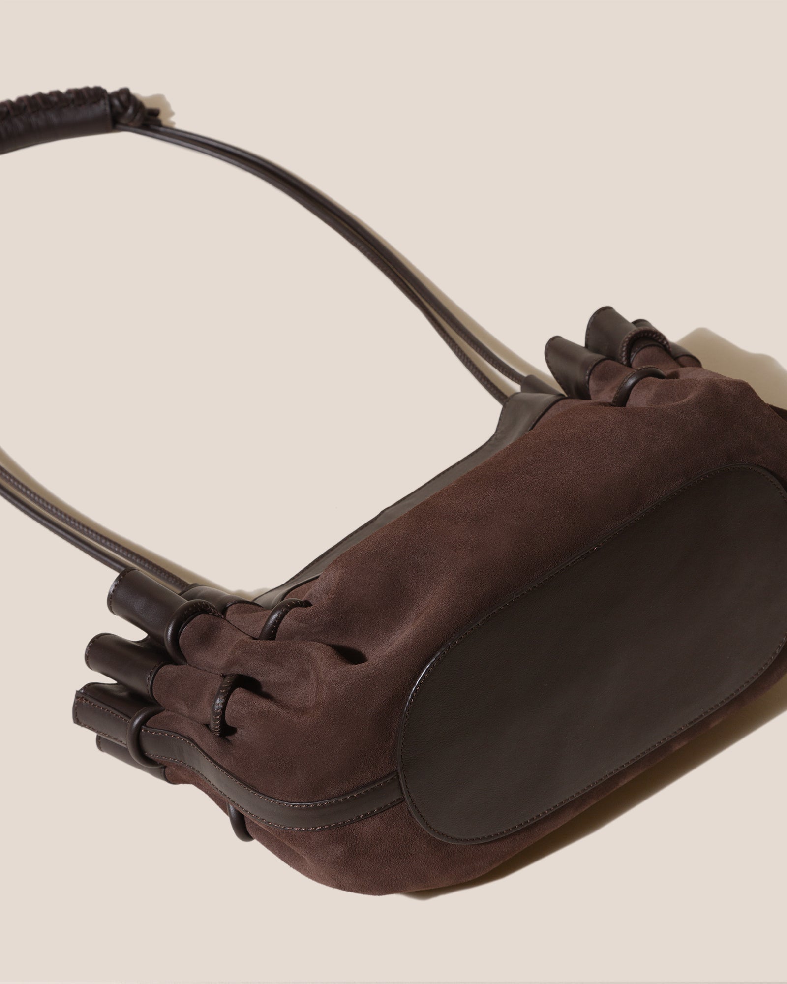 Pleated hand/shoulder bag crafted in suede leather and edged with smooth calf leather.