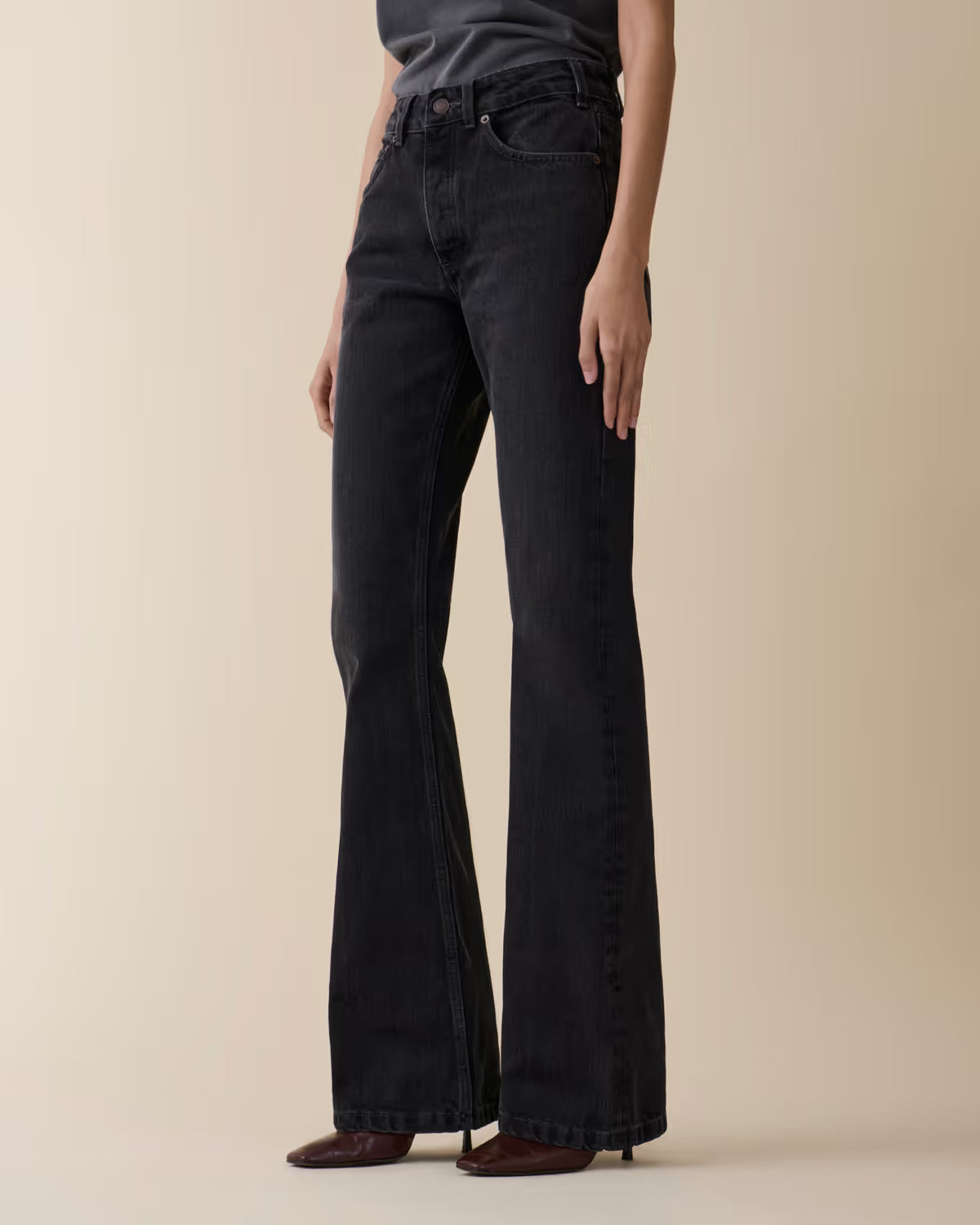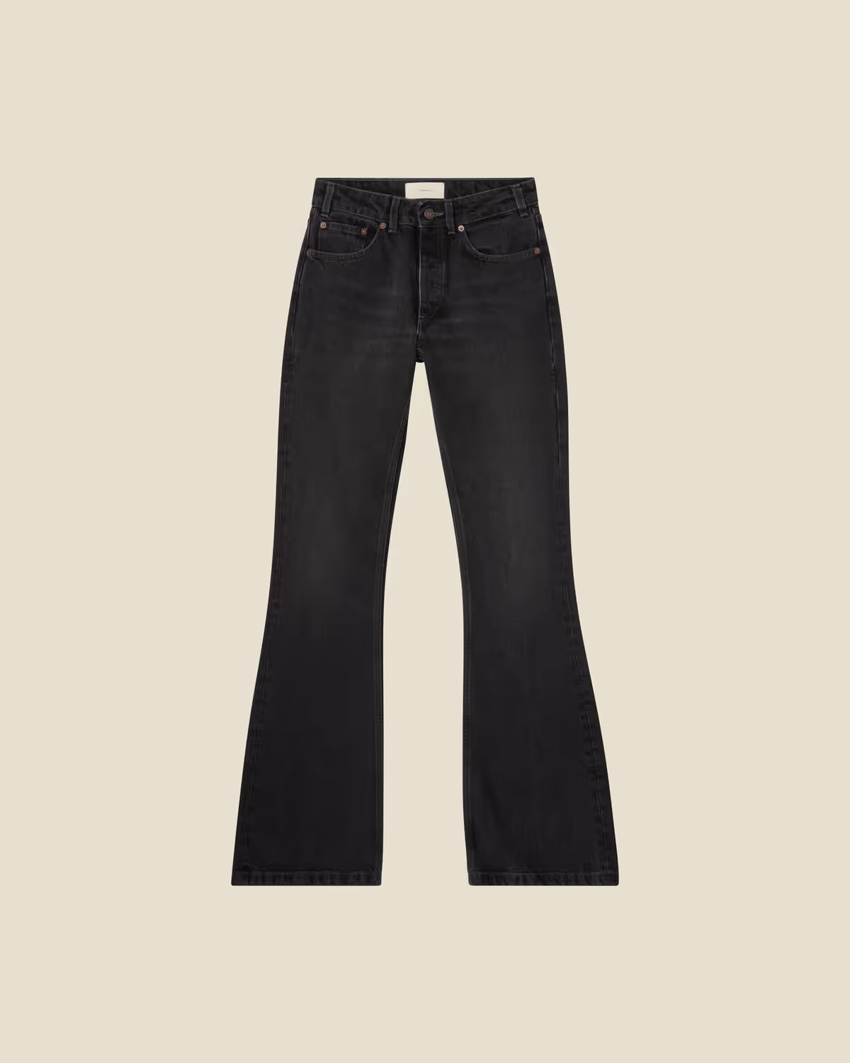 Moda' is a mid-waist denim with a slim flared leg. Featuring a fitted top, button fly and a slim leg until the knee enhancing a feminine silhouette.