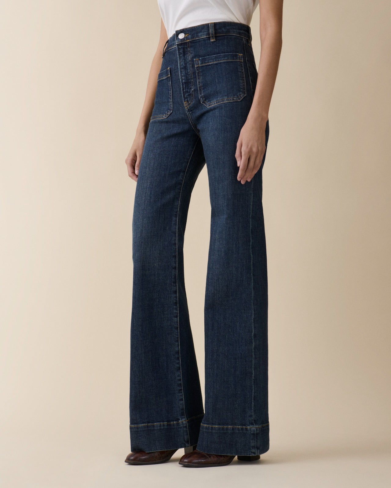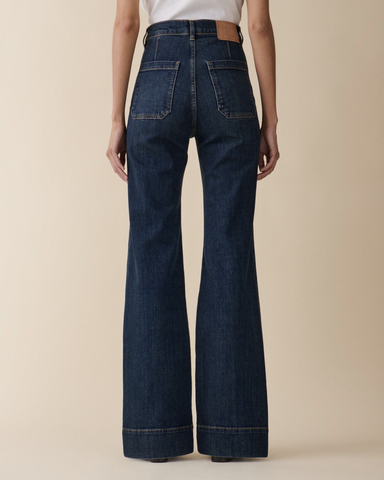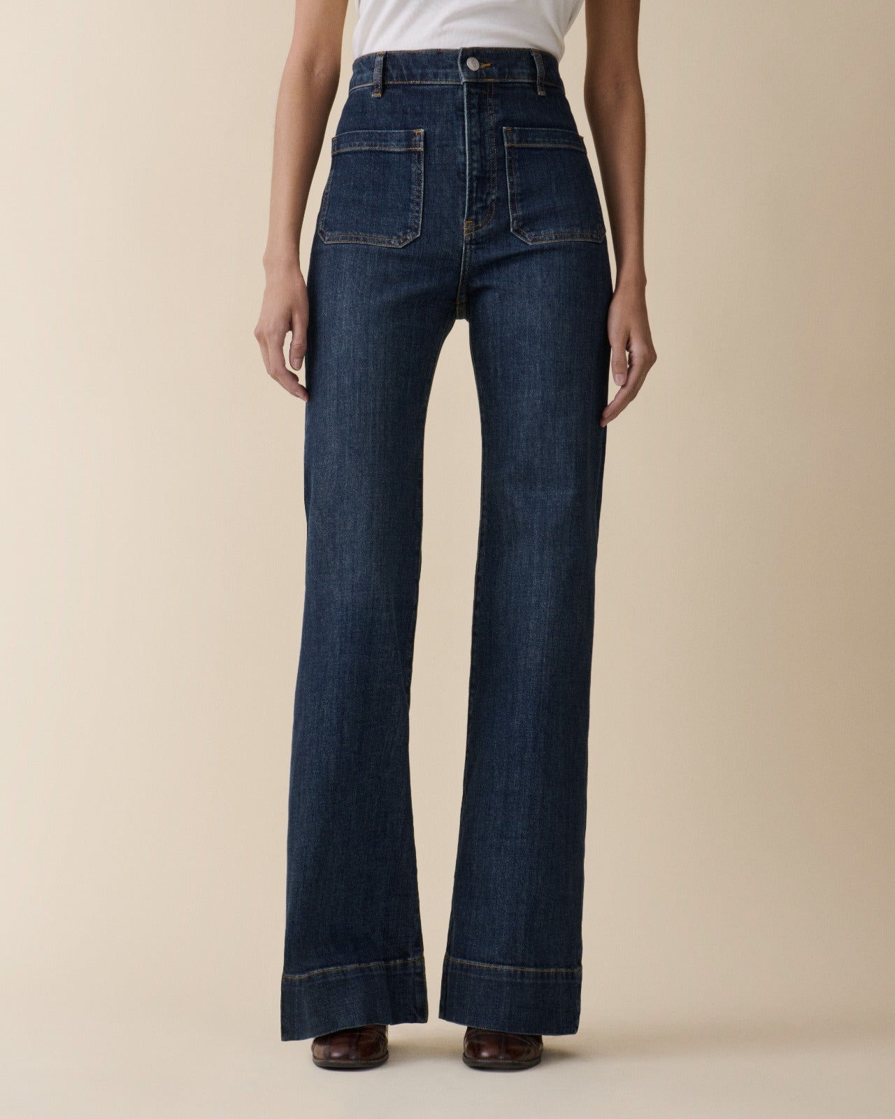 St. Monica looks to sailor archives of the late 1960s with its patch pockets, flares and wide hemlines. Featuring a zip fly, high-rise waist and wide leg.