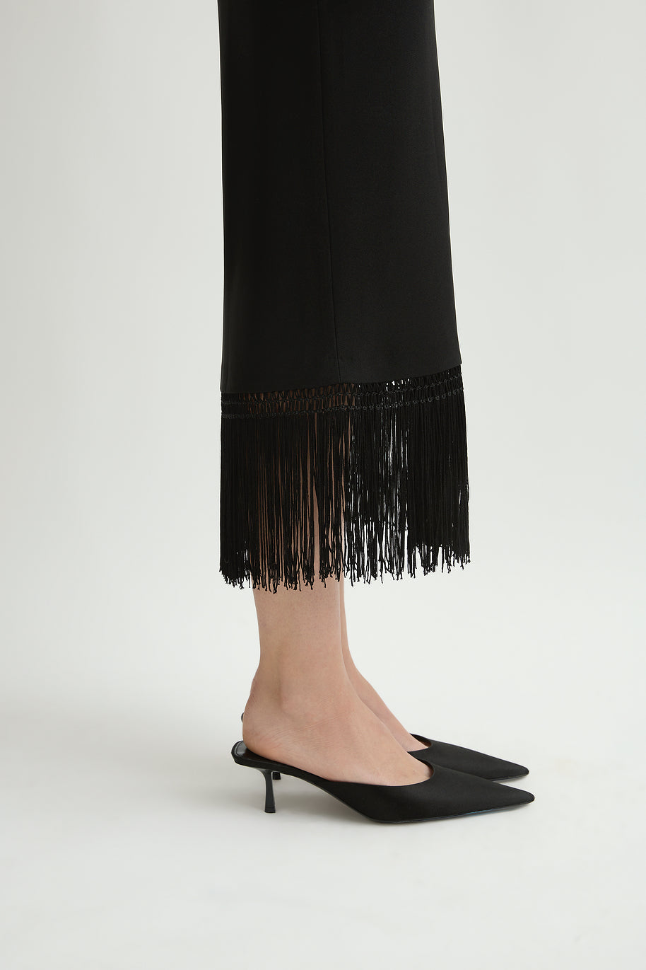 The Bianca Dress is crafted from black crepe and cut on the bias to create a flattering, body-skimming silhouette. It features a classic round neckline, a softly scooped back, and a gently flared hem, finished with delicate tassel fringe for subtle movement.