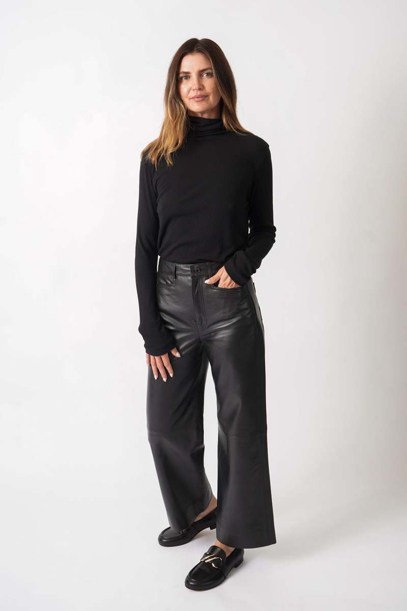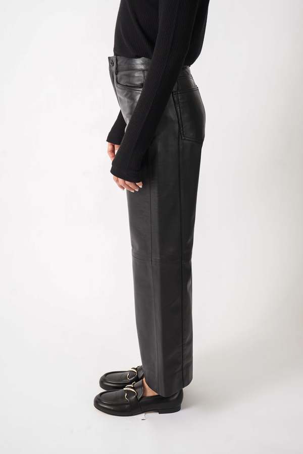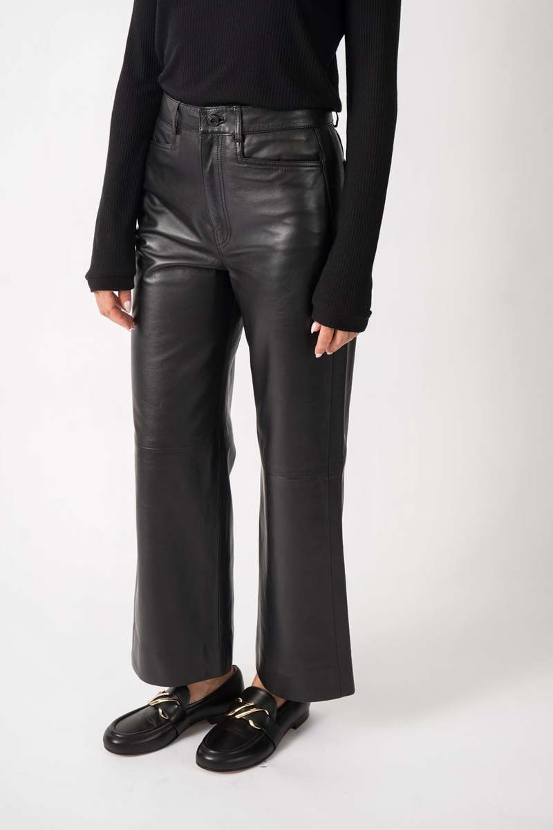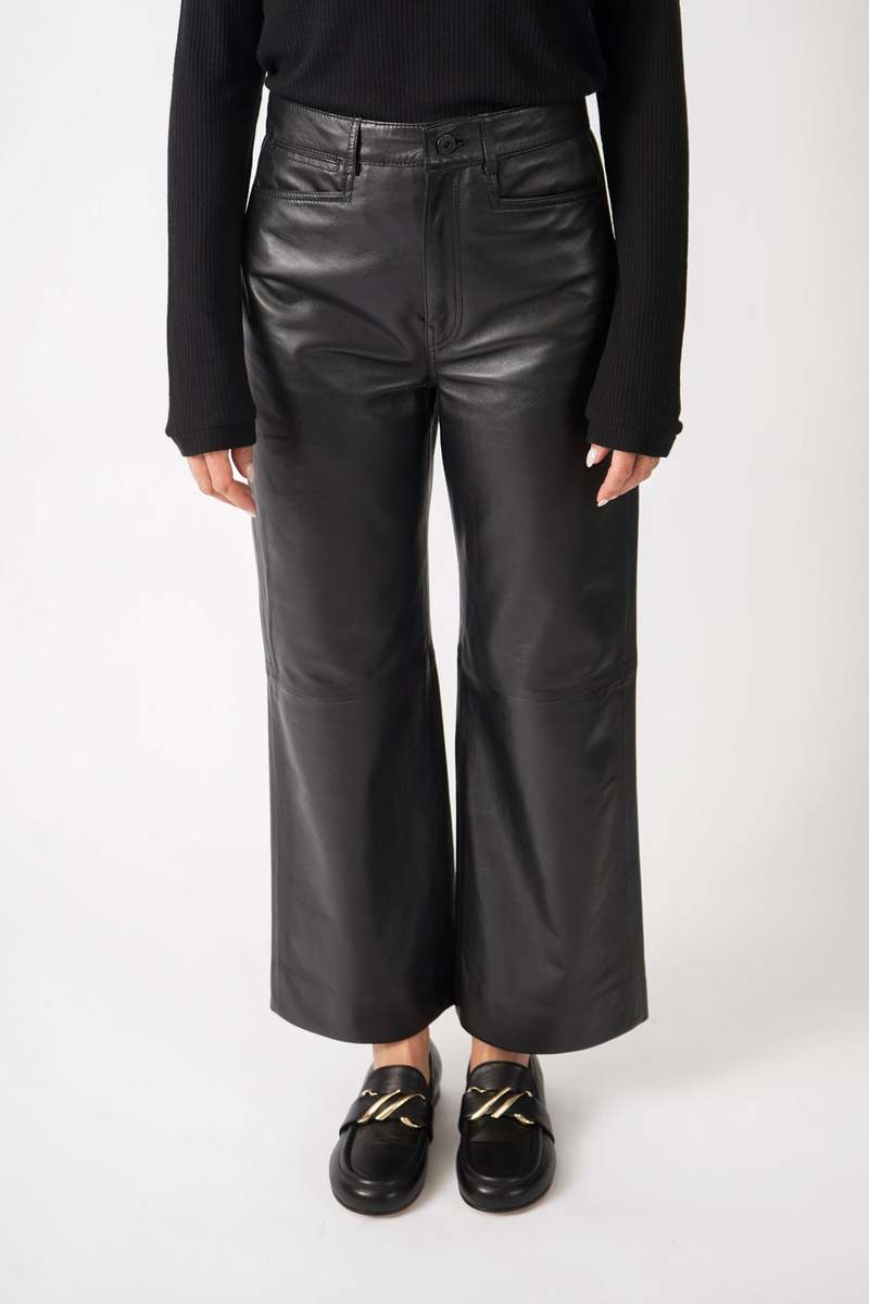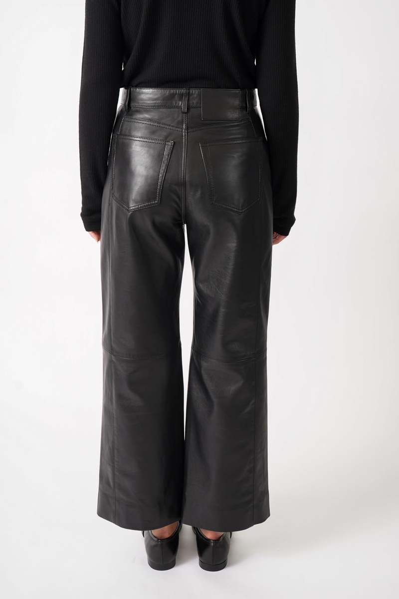 High waisted wide-leg black leather pants with a cropped hem, a paneled design, front slip pockets, and back patch pockets. Crafted in butter-soft, lightweight nappa leather. Finished with a concealed center-front zip and a metal button fastening.