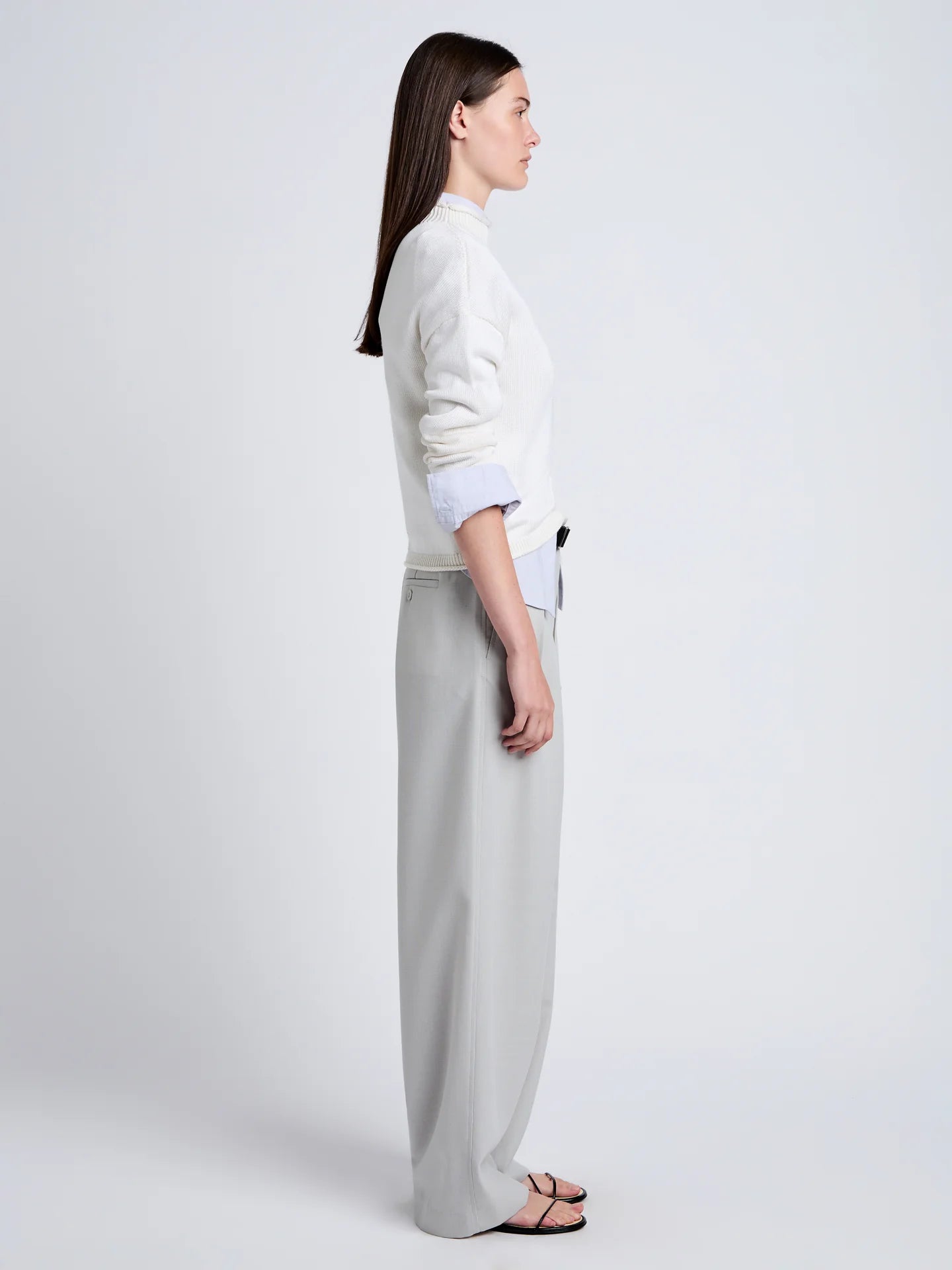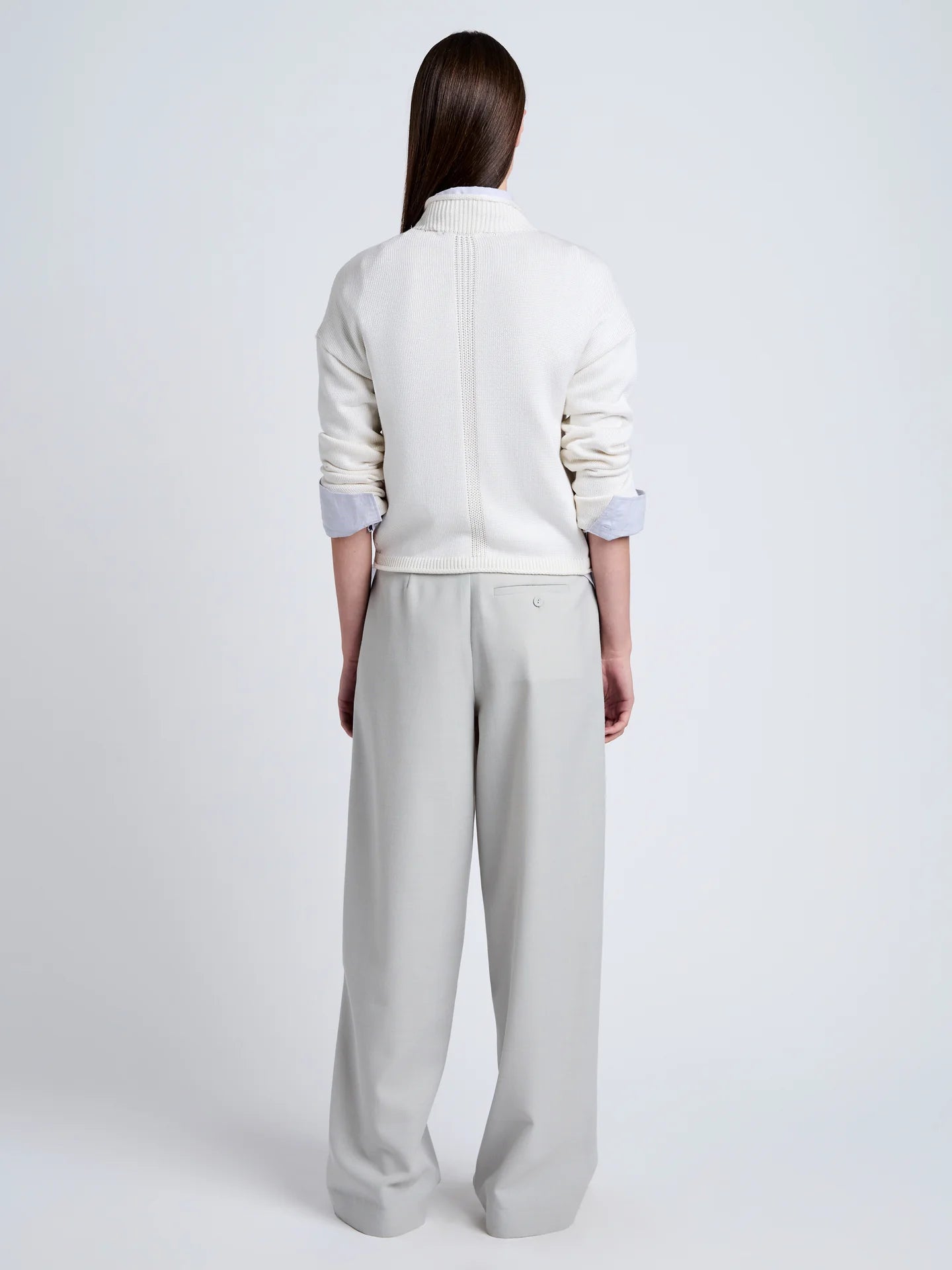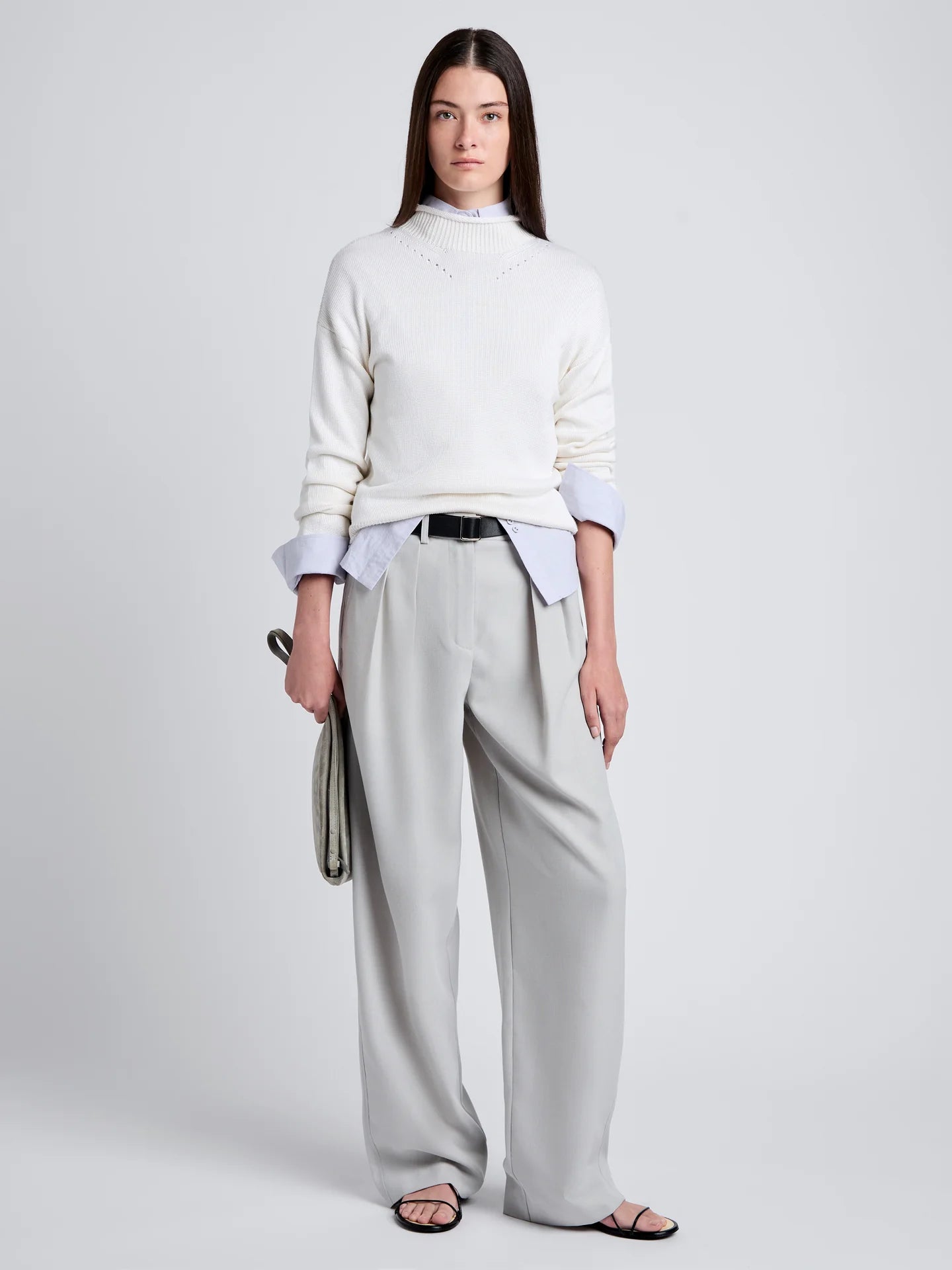 The Shea Sweater in Plaited Viscose Rib is crafted to a slim silhouette with a high neck. Features rolled hems, pointelle stitching, and drop shoulders with slim sleeves.