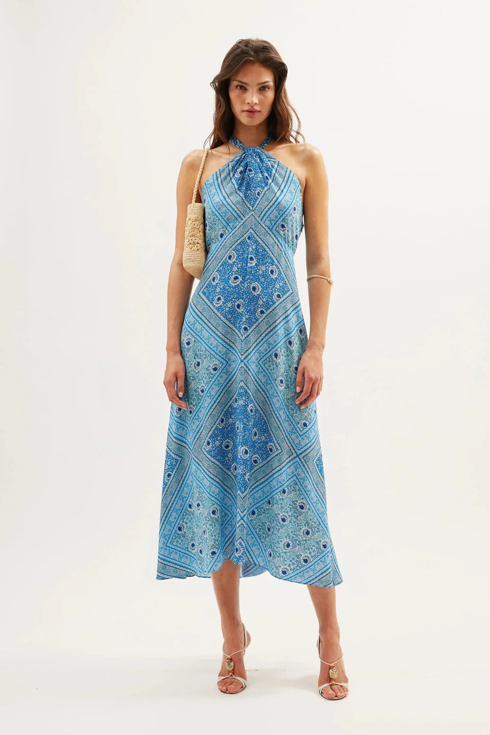 Our satin Caitlin dress is designed with an elegant halterneck and swing shape body. The blue scarf print matches the boho feel perfectly.
