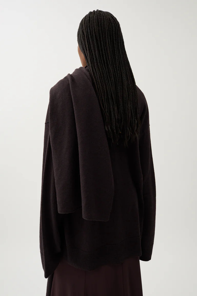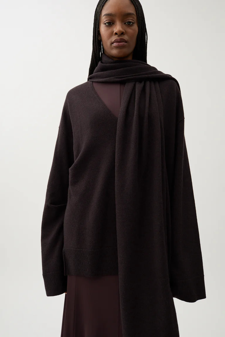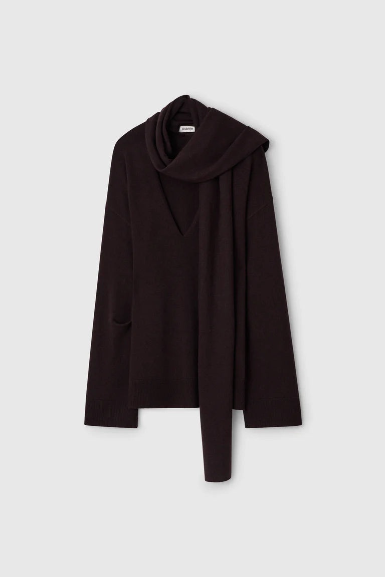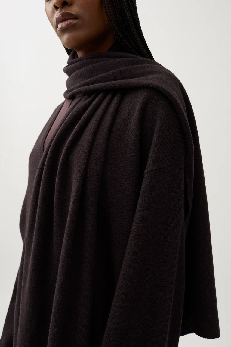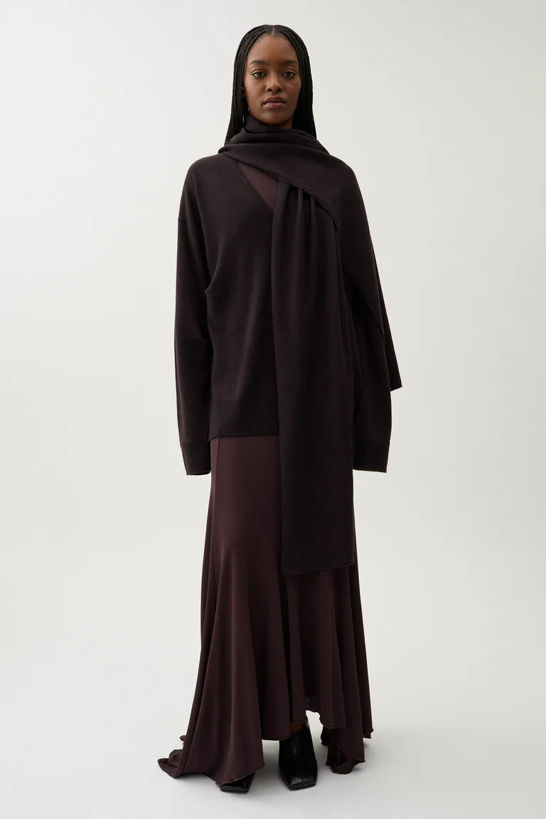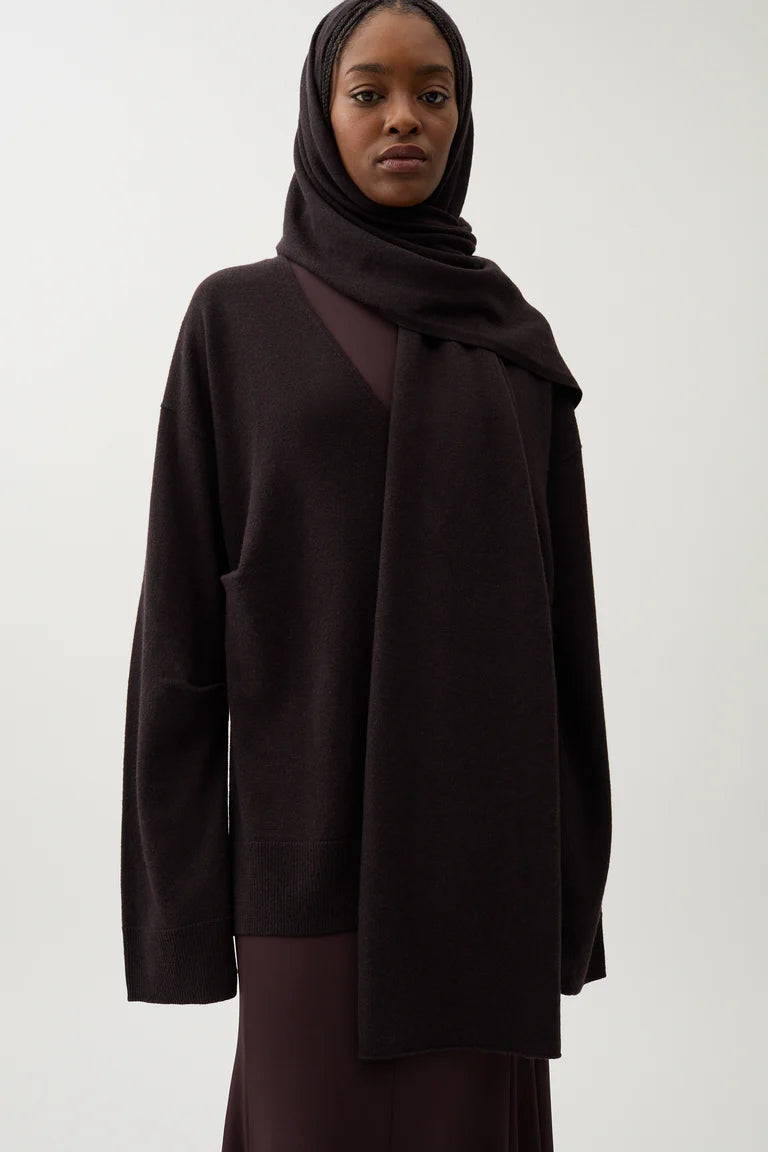 Relaxed yet refined, the Phlox sweater is a wardrobe staple with a sophisticated twist. Knit from 100% certified merino wool, it is shaped with a V-neckline with elongated sleeves and an asymmetrical hemline. It arrives with a detachable scarf for versatile styling.