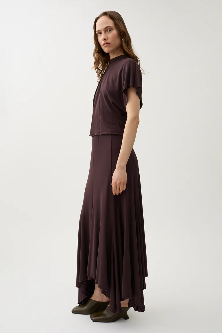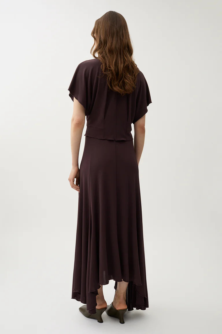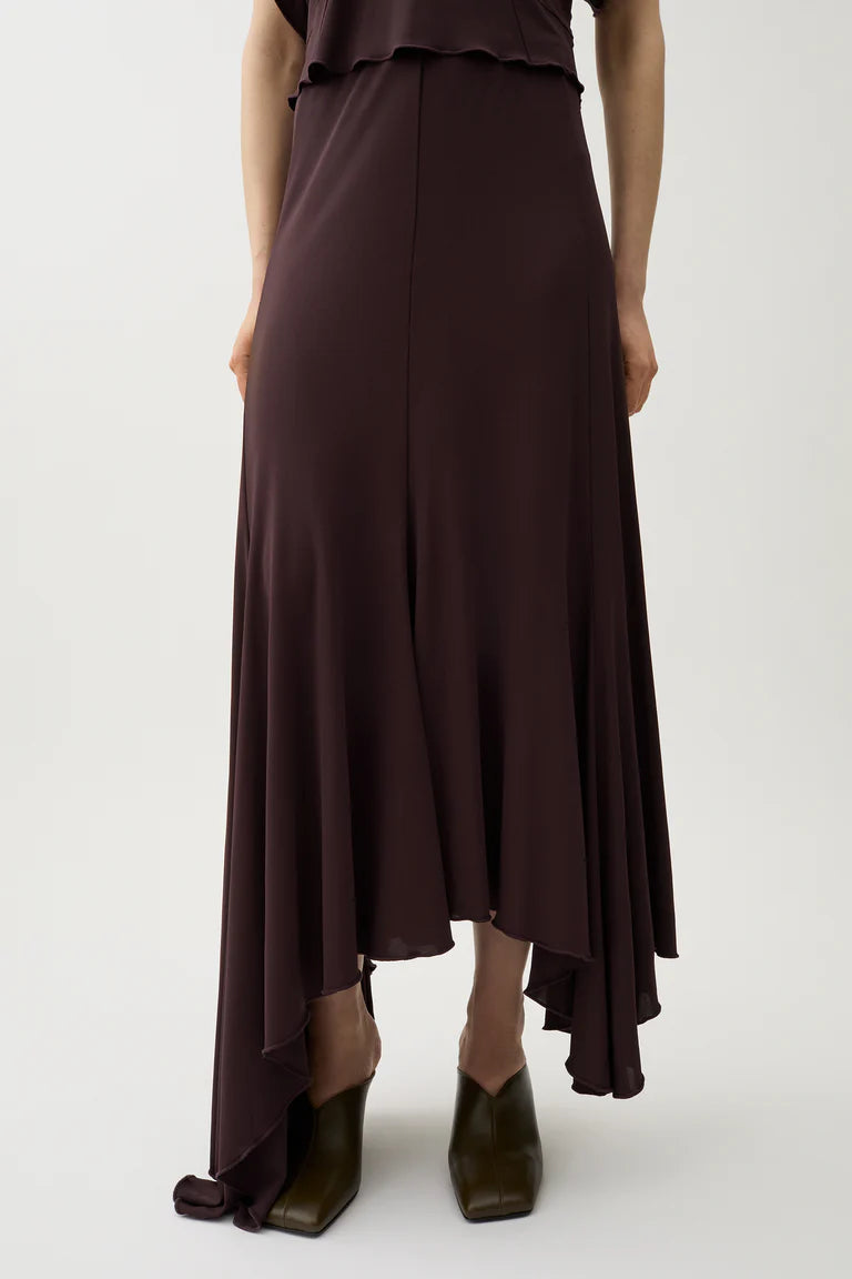 With its flowing silhouette and fluid fabrication, the Sandy skirt is essential for the ‘Strict Hippie’ wardrobe. It has an elasticated waistband for optimal comfort, and falls with gentle folds towards its asymmetrical hemline. Emphasize the movement of this piece by styling with draped blouses.