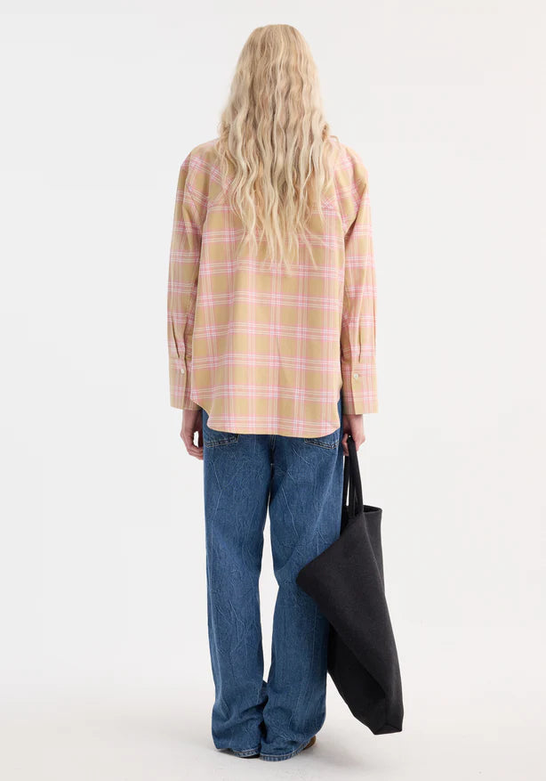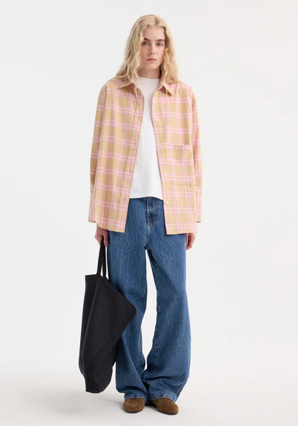A soft flannel classic button down overshirt with a relaxed silhouette, crafted in a pink check pattern for a casual yet elevated everyday layer.