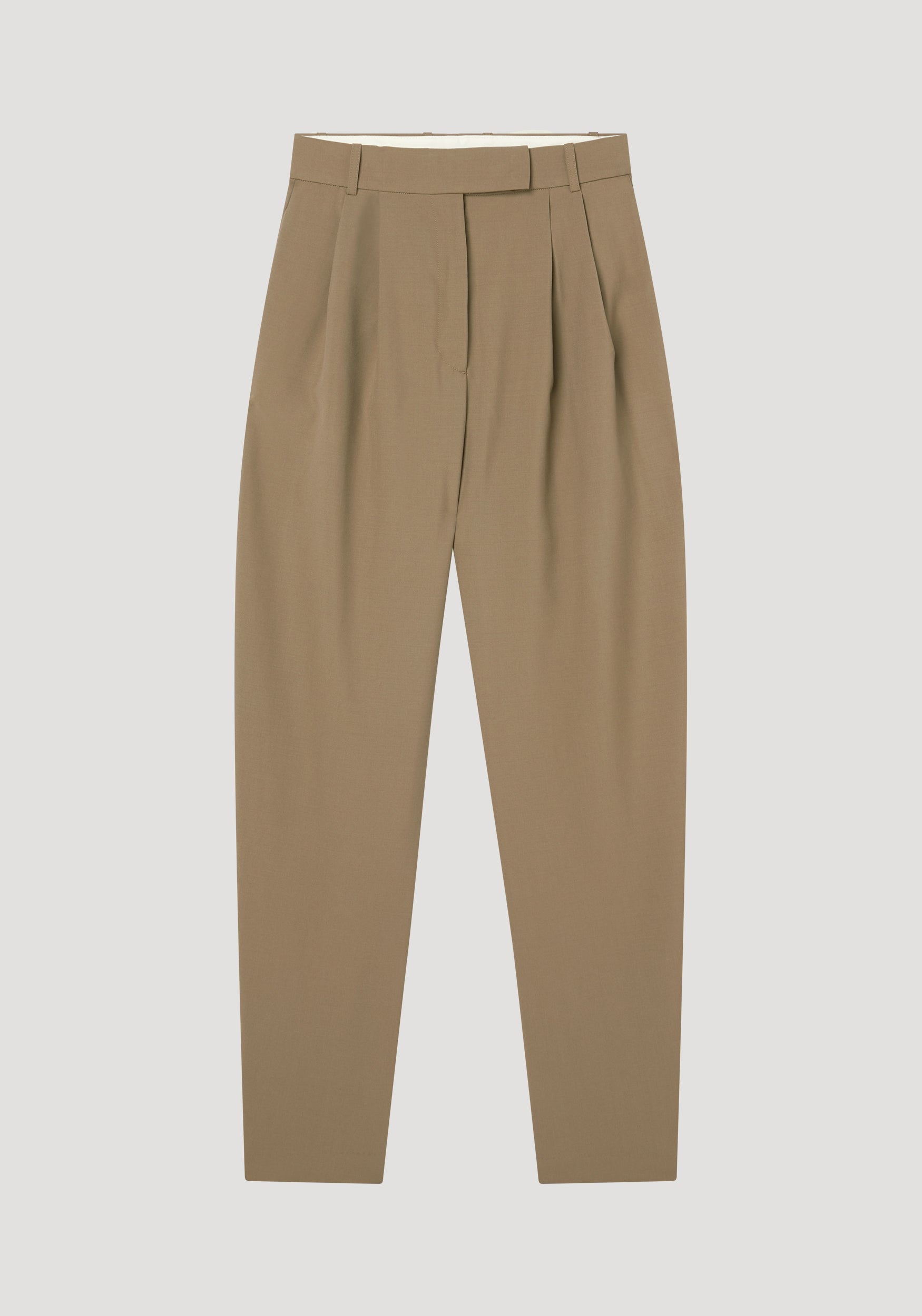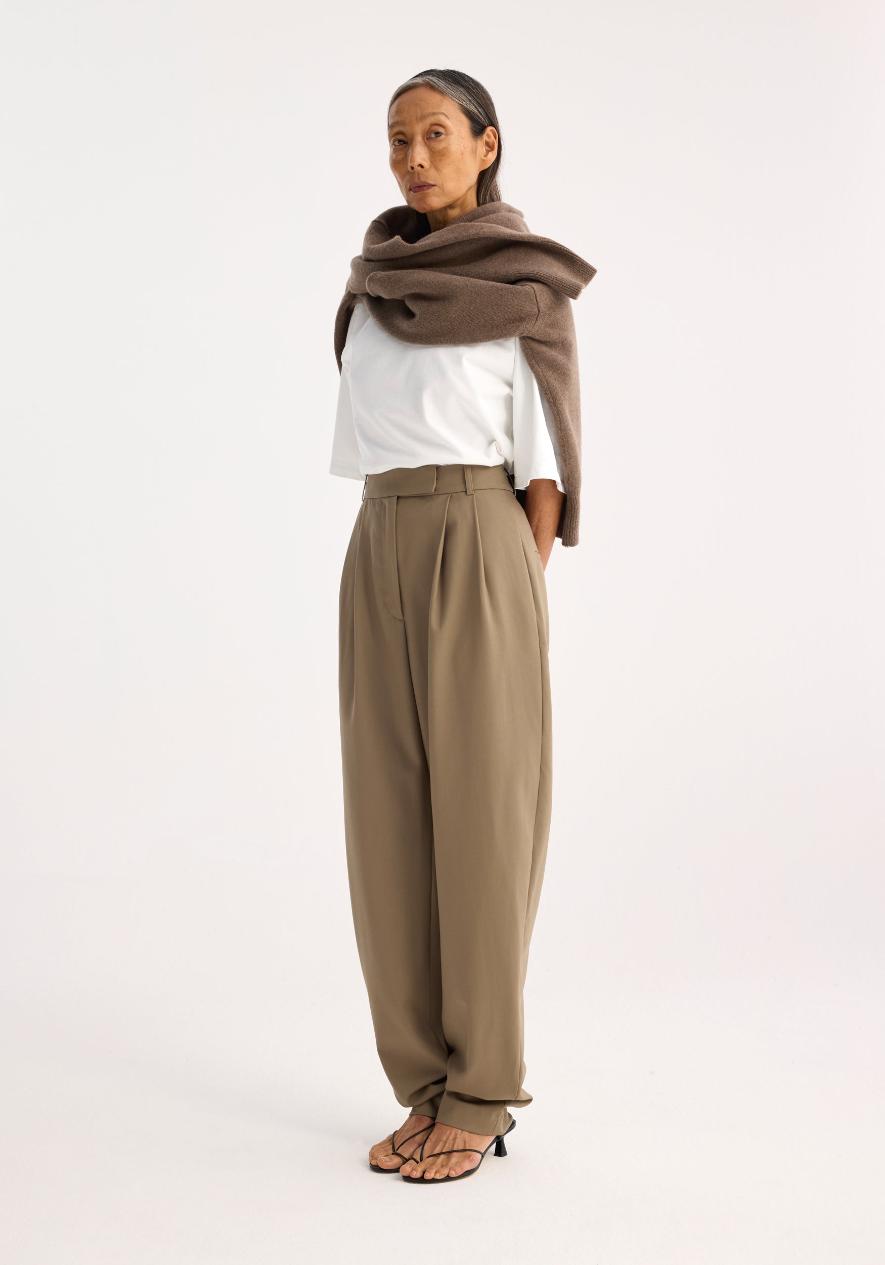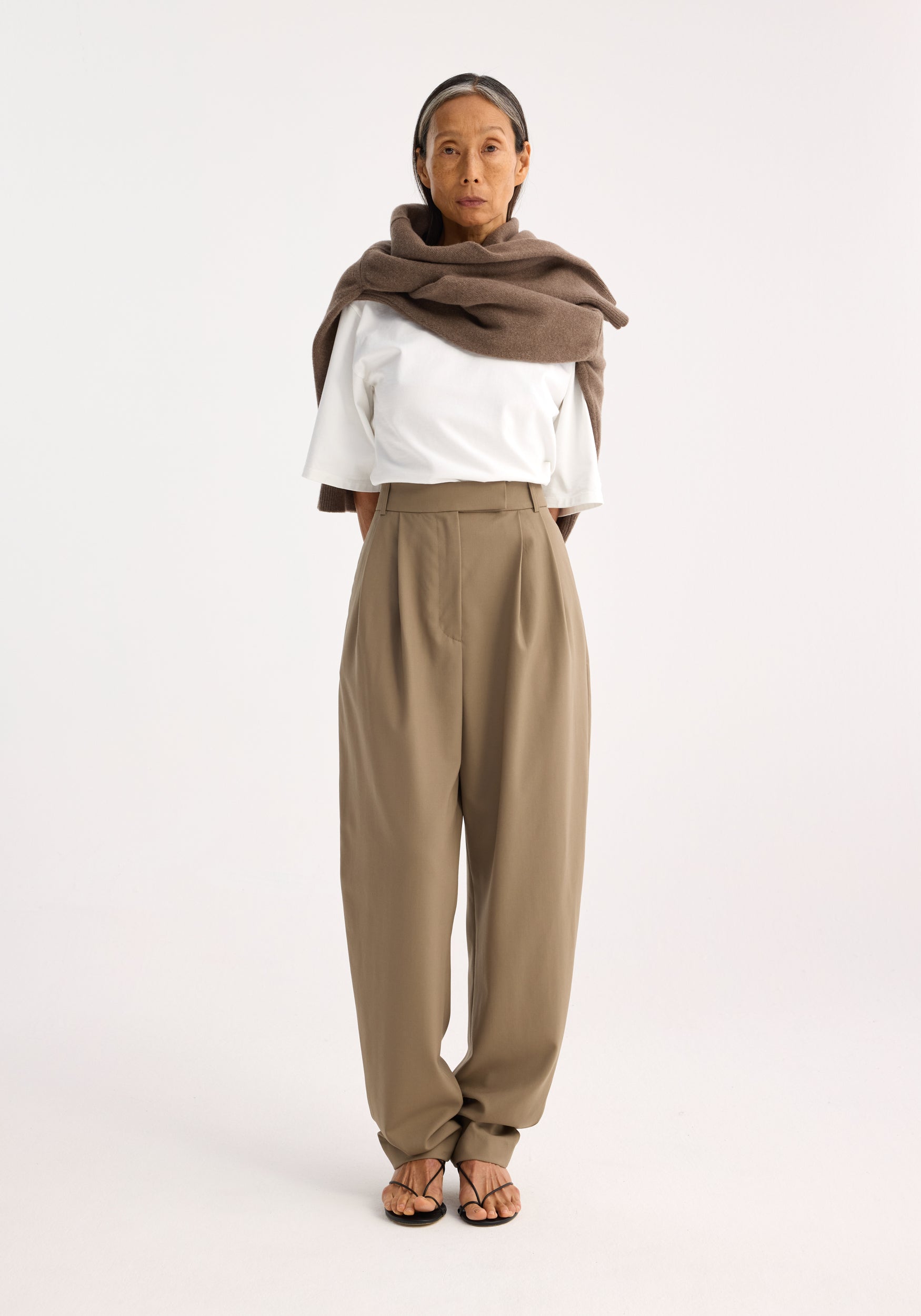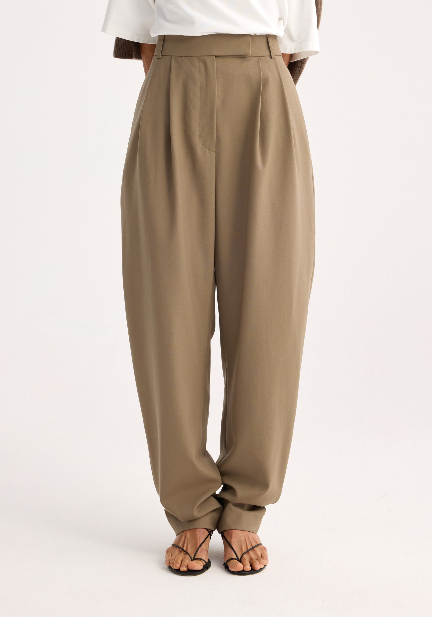 Crafted from a soft virgin wool fabric, these high-waisted trousers feature a round barrel leg silhouette and double pleats for a structured yet relaxed fit. The seasonal khaki tone adds a modern twist, while slanted side pockets and welt pockets at the back provide functional detailing.