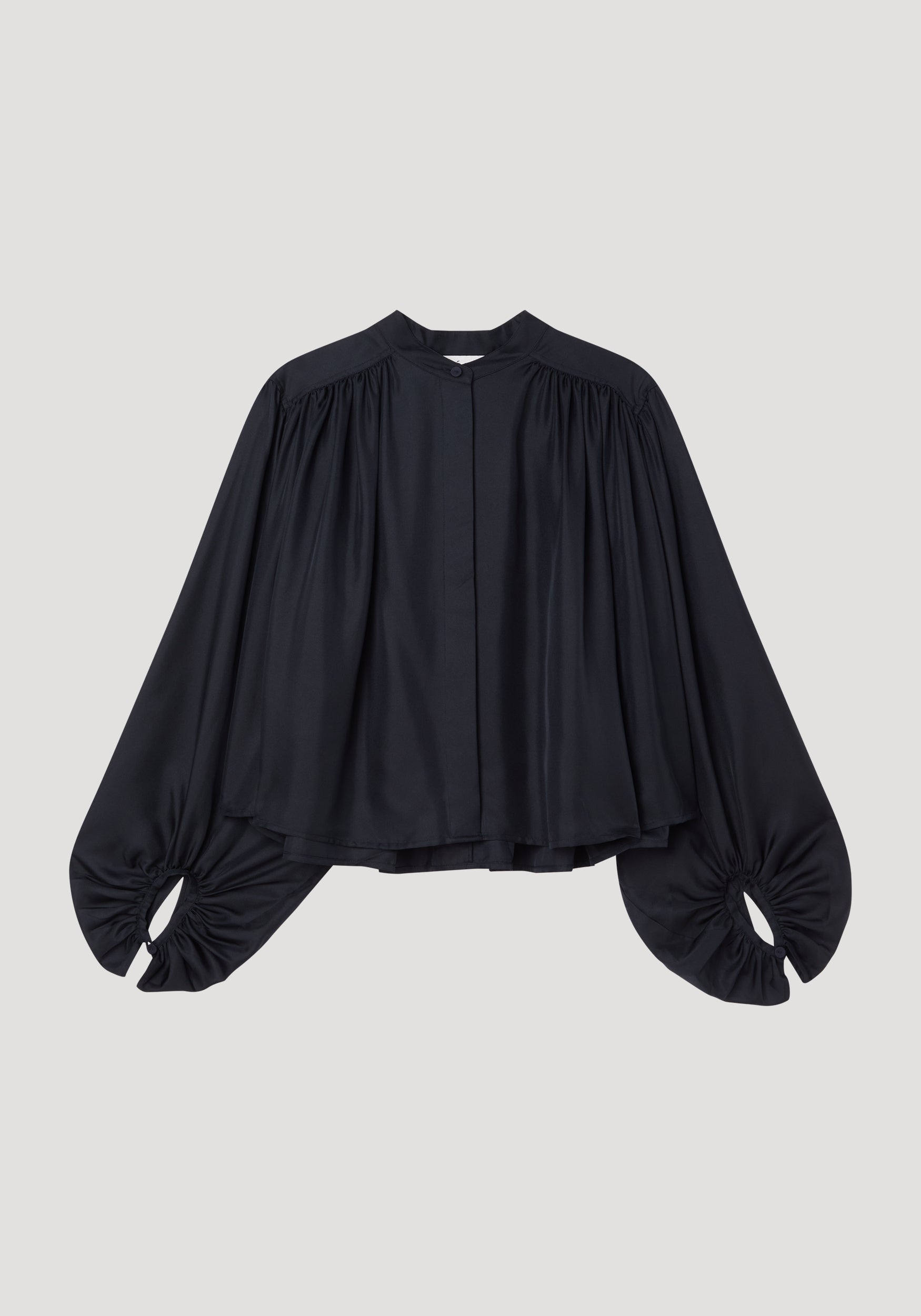 The silk pleated top is crafted from flowy silk and features a mandarin collar with soft front and back gathered pleats that add a voluminous structure. Designed with long wide balloon sleeves, it has a blind placket and shell-covered buttons for a refined finish.