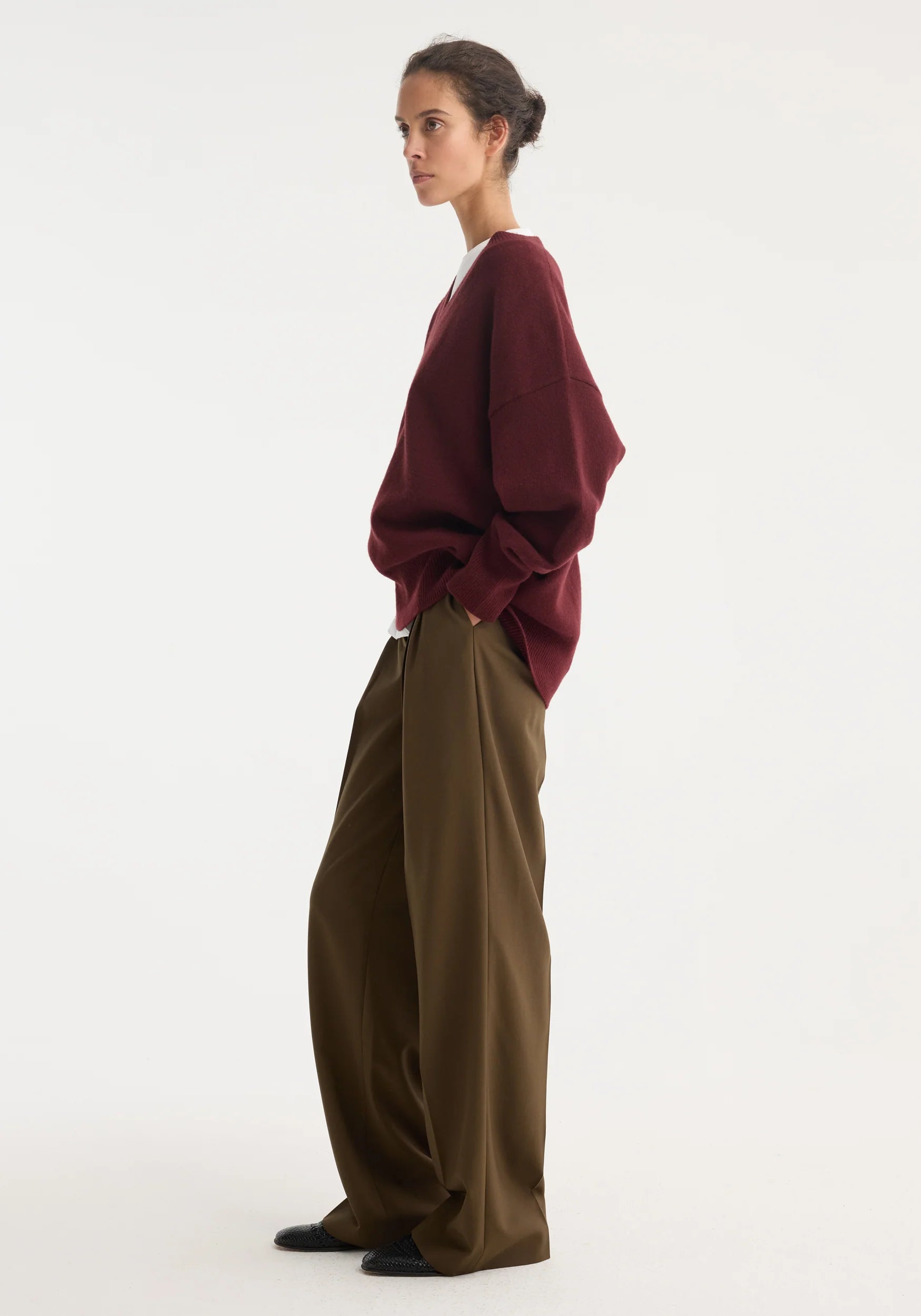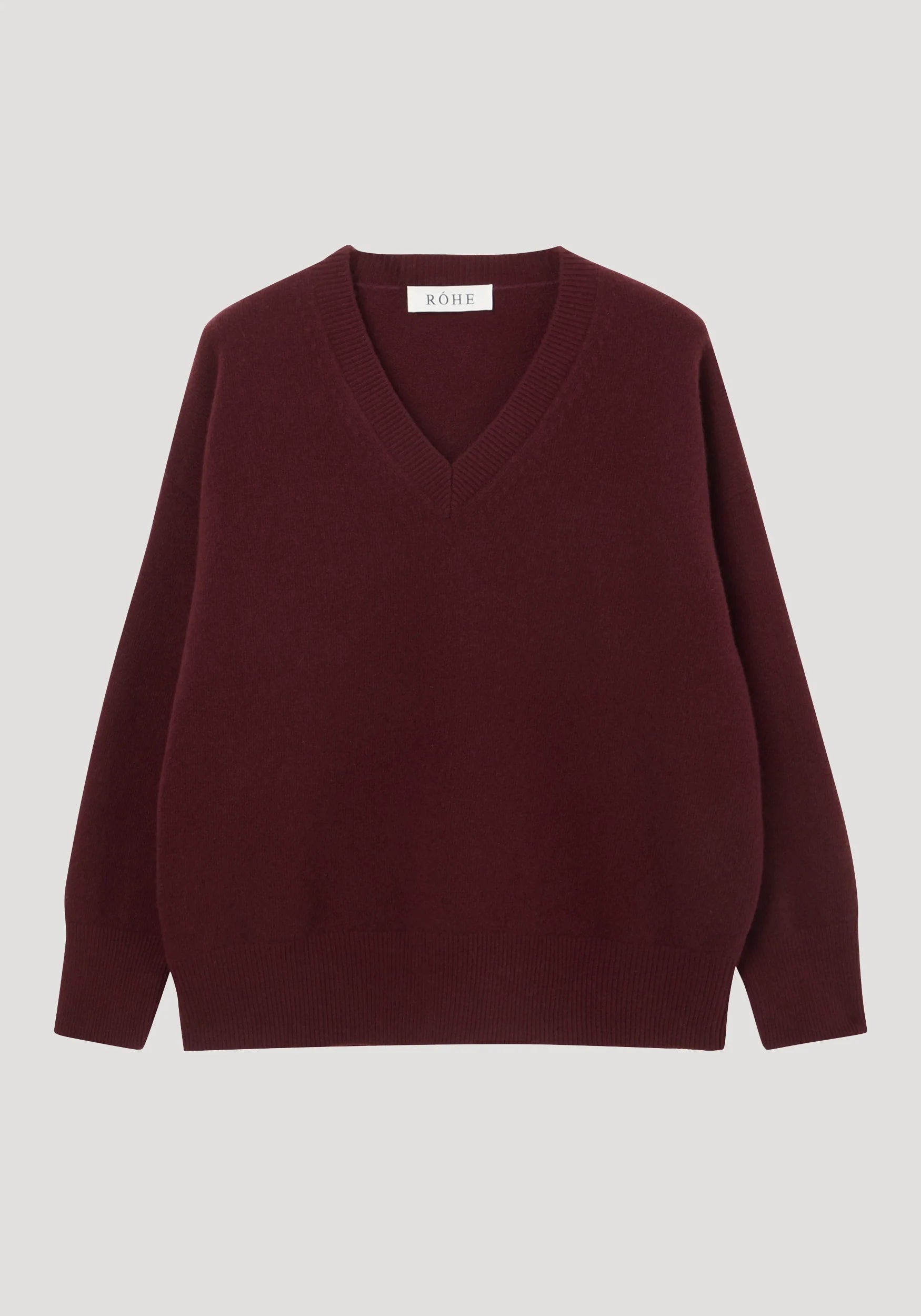 A classic v-neck knit design for everyday wear, this piece offers style and comfort in perfect unison. Designed with a relaxed fit with a drop shoulder, knitted from a soft wool-blend yarn in a deep burgundy tone crafted by Italian mill Lanecardate.