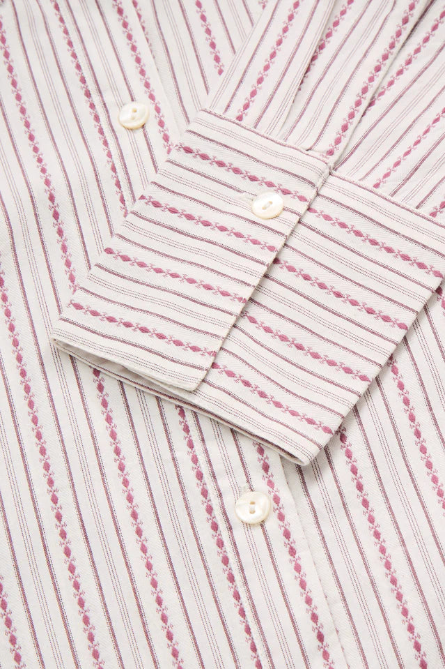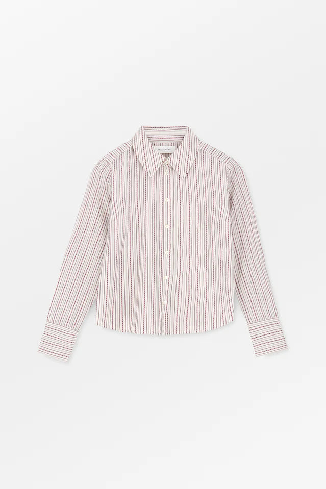 Fauna Shirt is a fitted shirt made in organic cotton, featuring beautifully crafted details. The shirt has a large pointed collar, long cuffs, and mother of pearl buttons. It has cutlines below the breast and in the back for a more tailored silhouette.