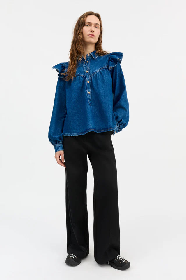 Mille Blouse in 100% organic cotton denim has a classic collar and a half placket with five small buttons. Flaring out with tiny tucks from a yoke, it has voluminous sleeves that gather into cuffs and two flounced cap sleeves add to the feminine silhouette.