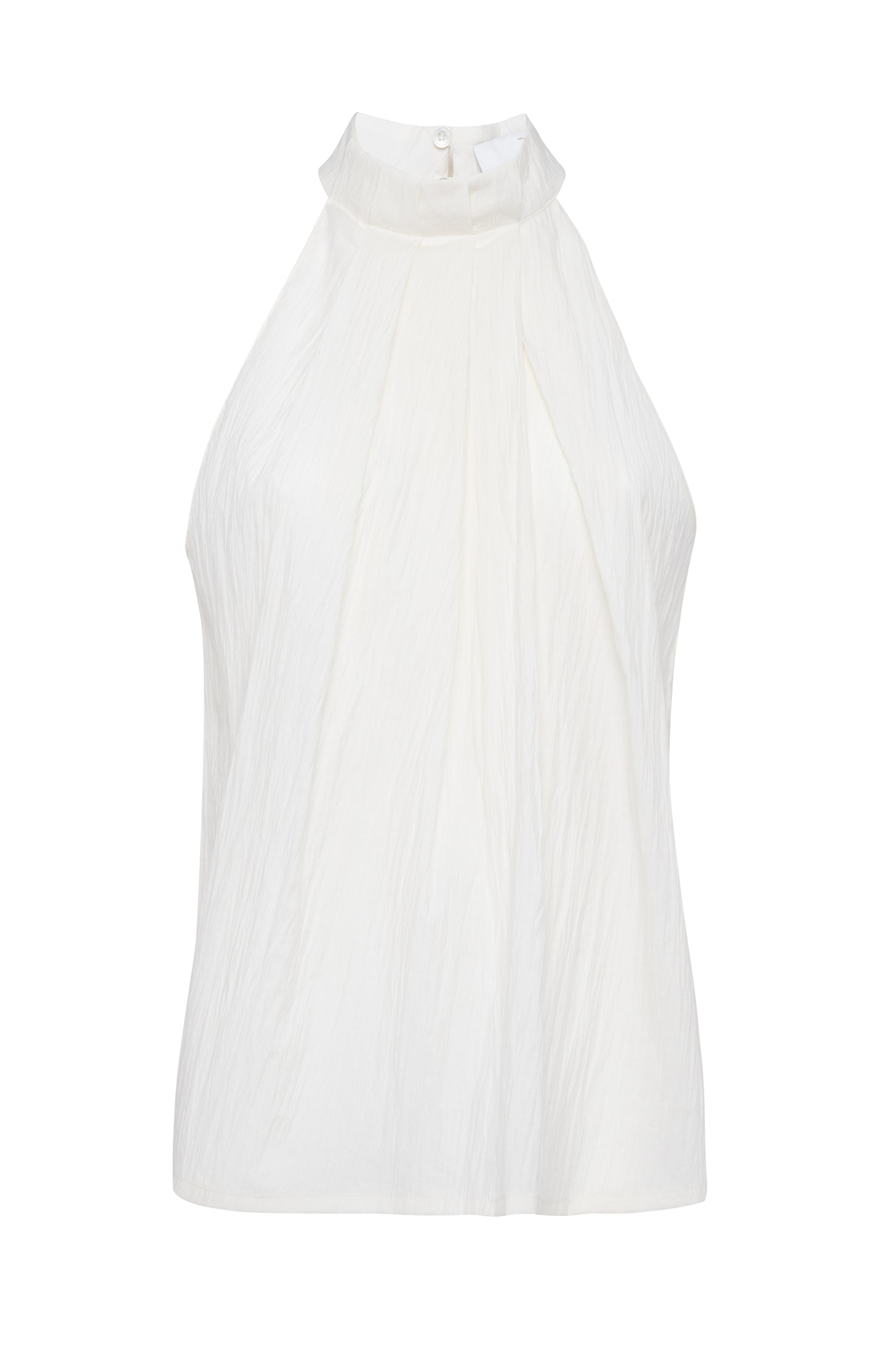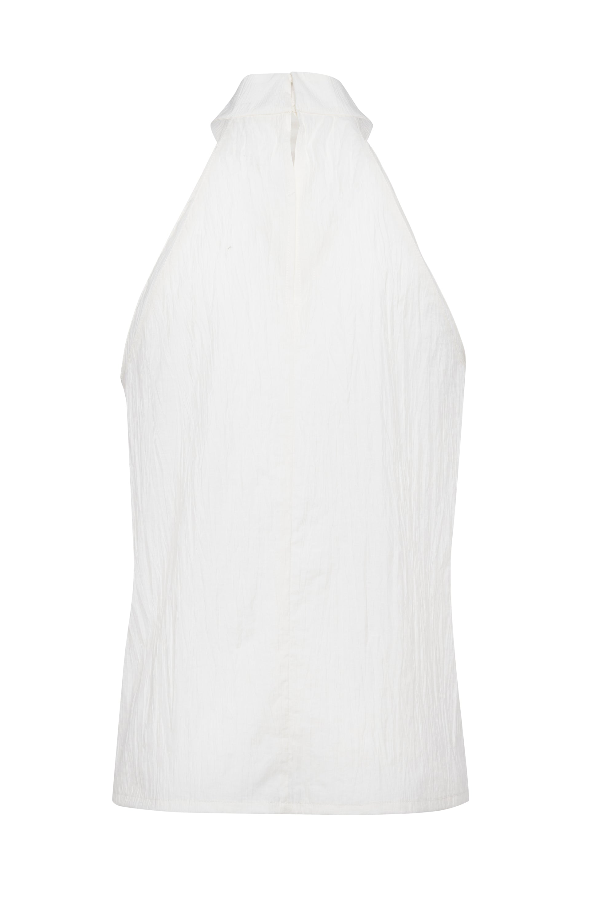 Halter neck top with hidden back button neck fastening in a crushed cotton blend fabric.