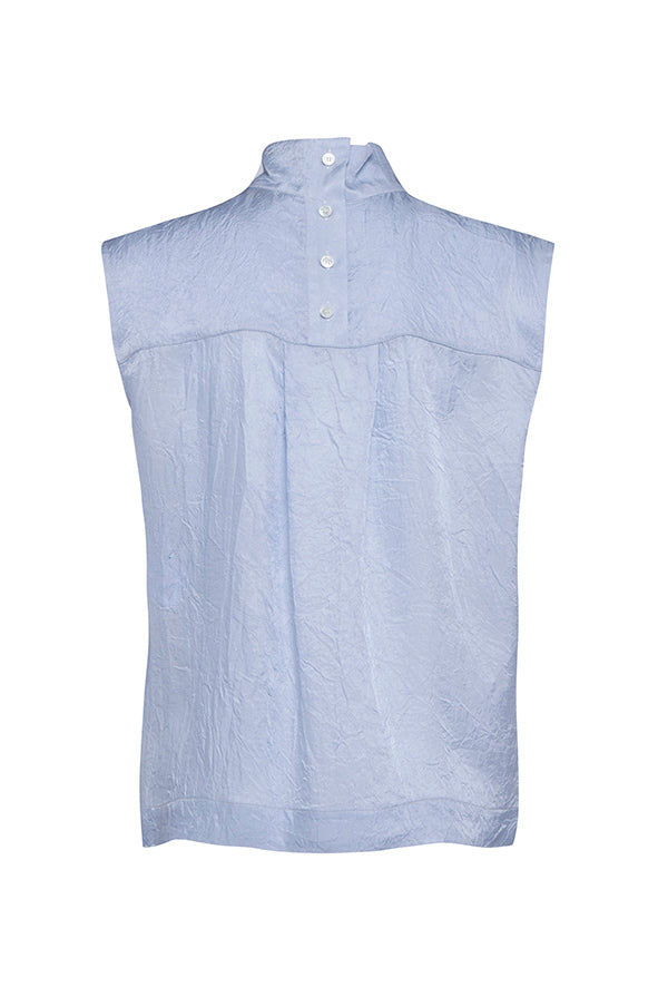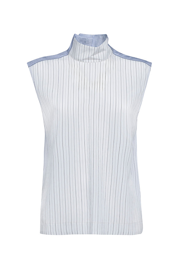 Sleeveless high neck top in viscose blend with a contrasting fabric on the back.