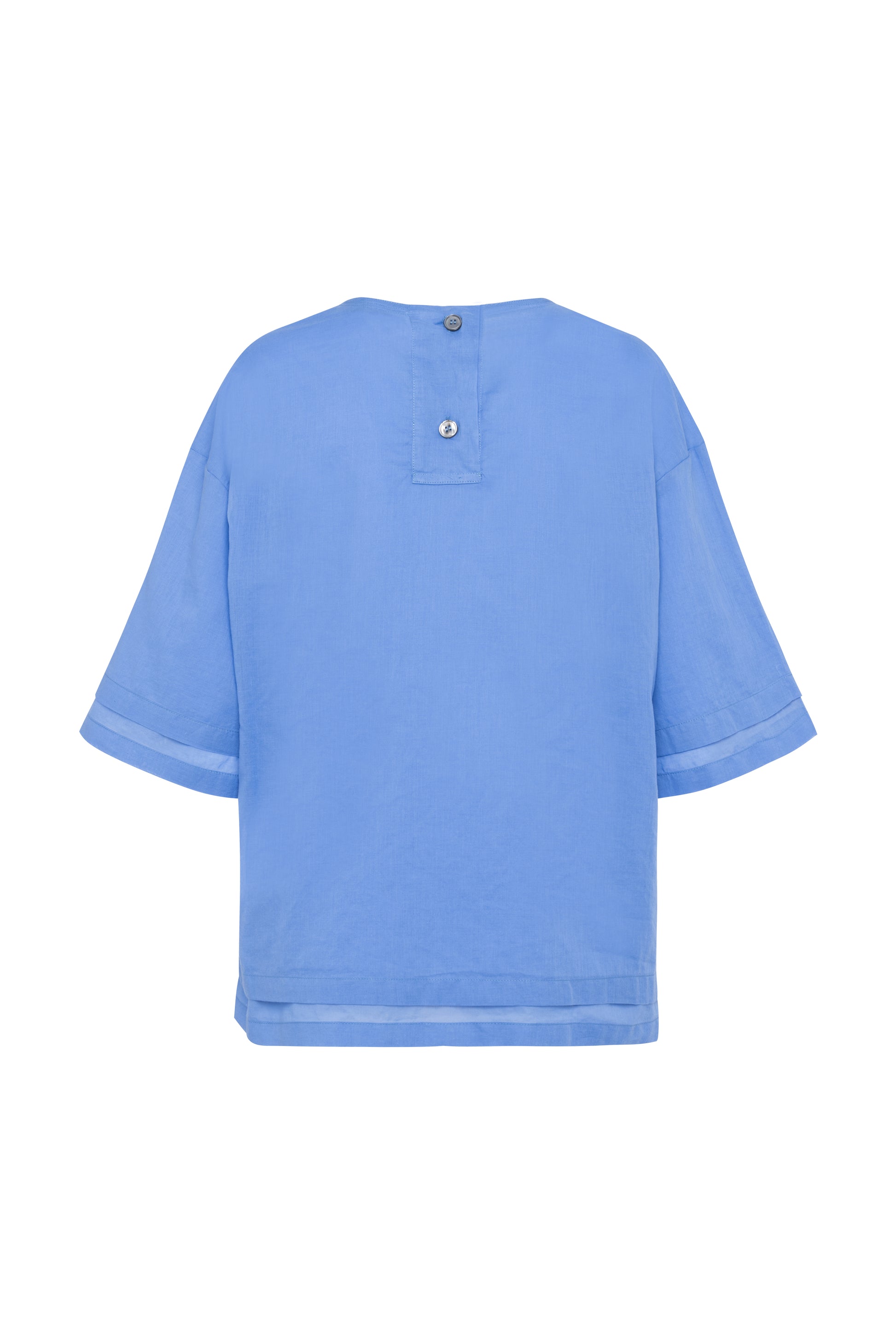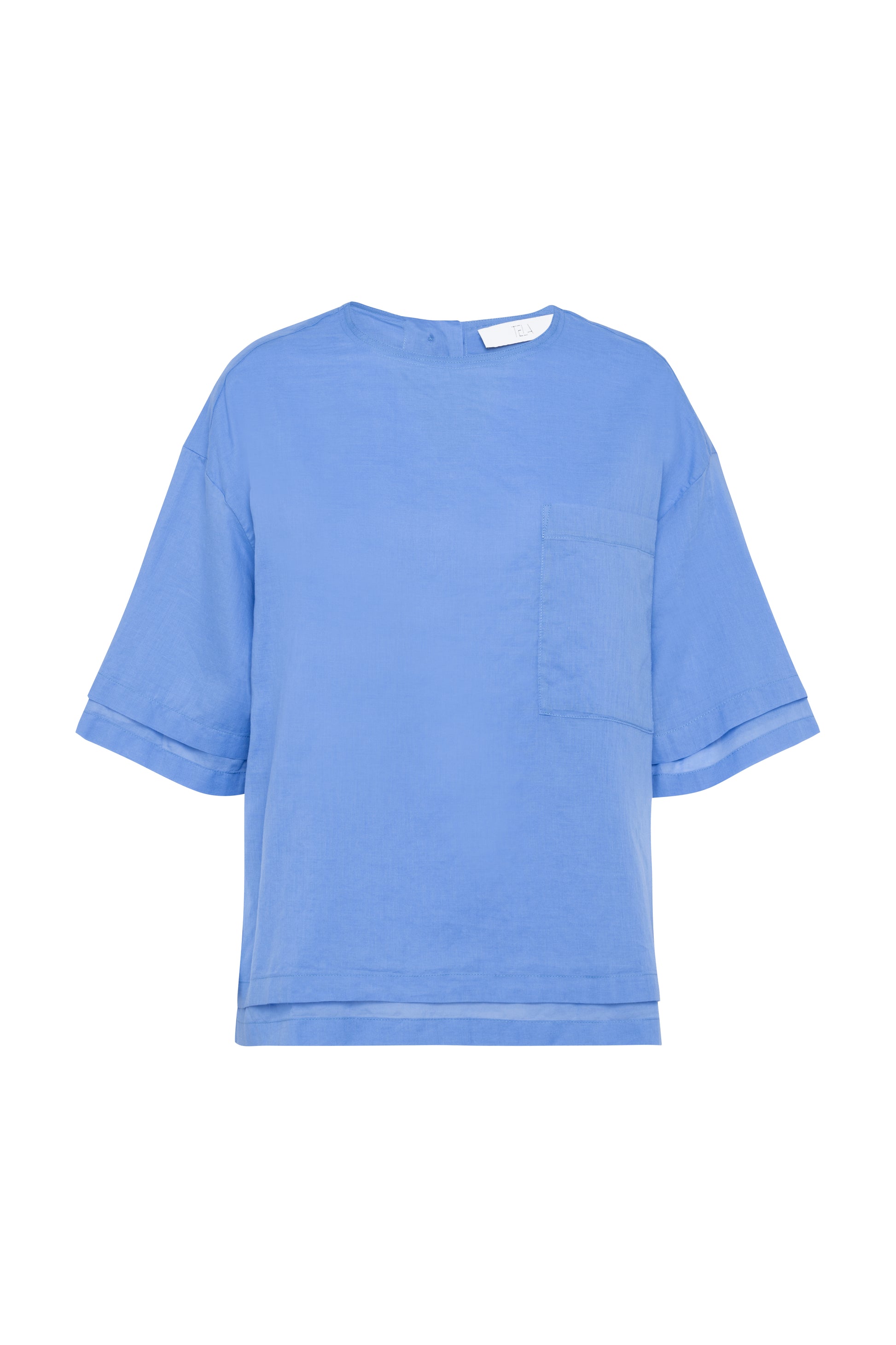 Boxy t-shirt in muslin cotton fabric, with an oversized patch pocket and buttoned neckline at the back.