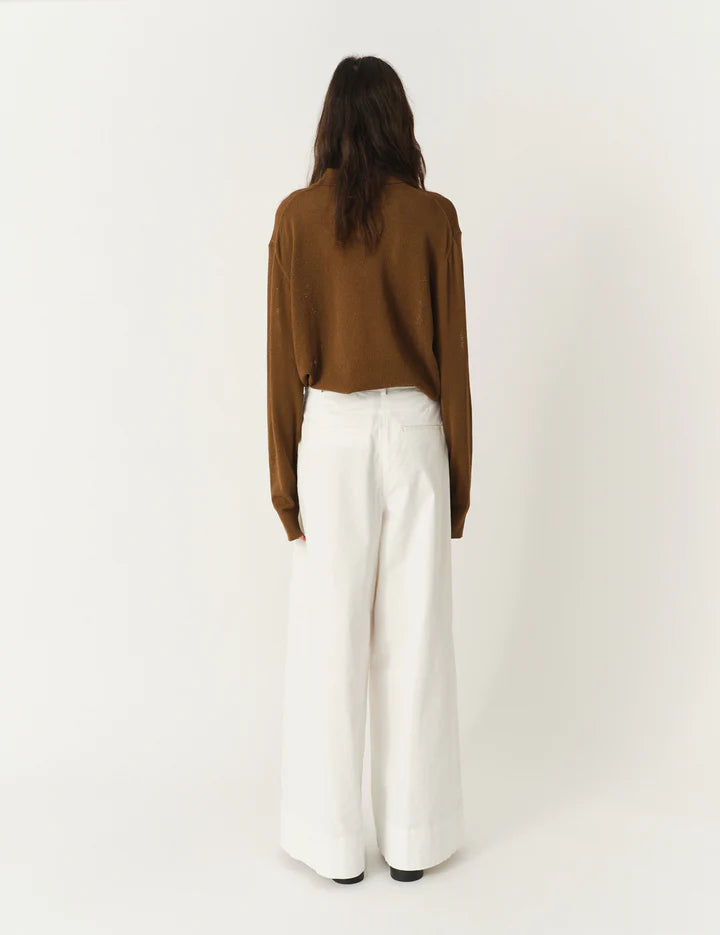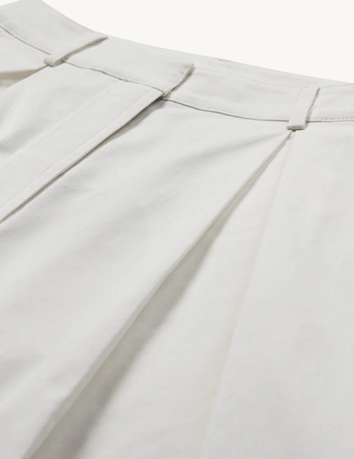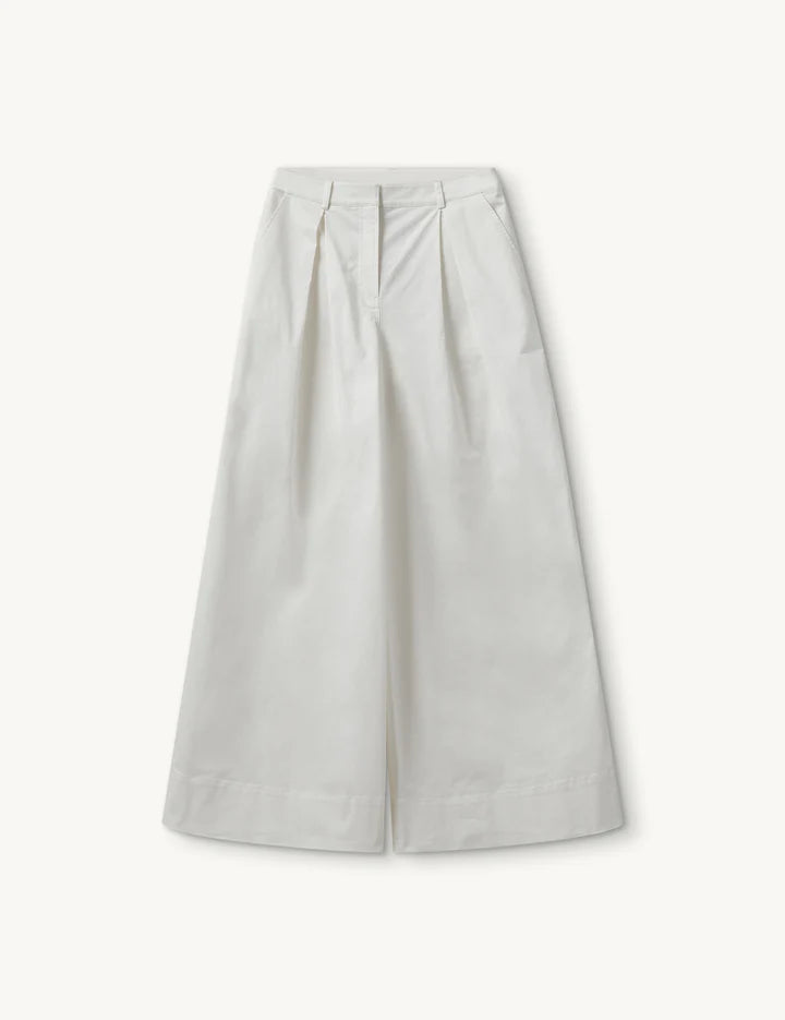 The Avelino Pants are wide pants with pleat details made from cotton. Their relaxed fit, elegant design, and breathable fabric make them a versatile choice for various occasions.