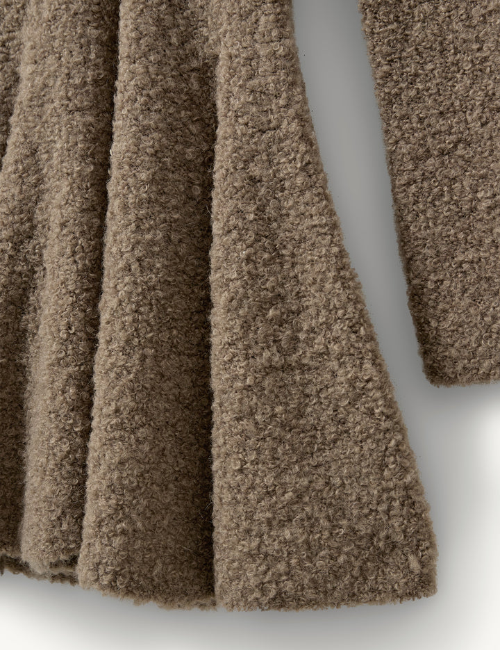 A feminine, modern knit dress featuring a flared, voluminous skirt and a collared neckline with button placket.
