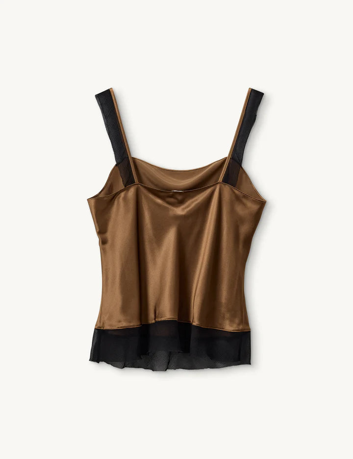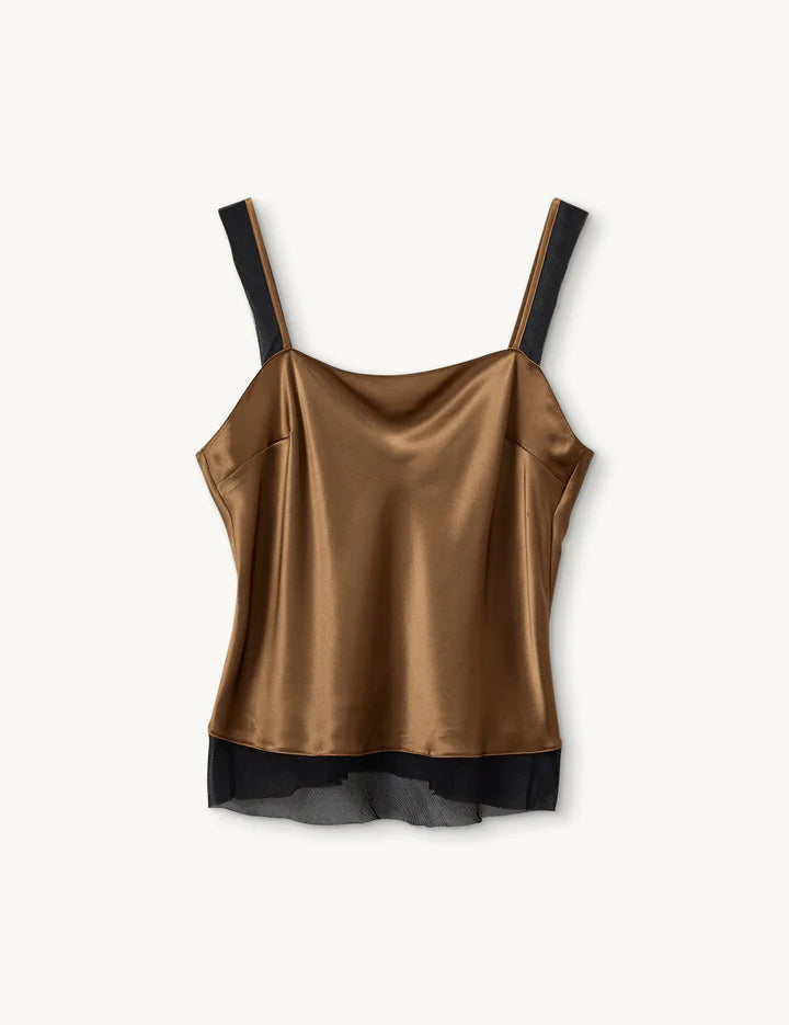 The Catania top is made from 100% silk and featuring delicate sheer detailing at the bottom and shoulder straps.