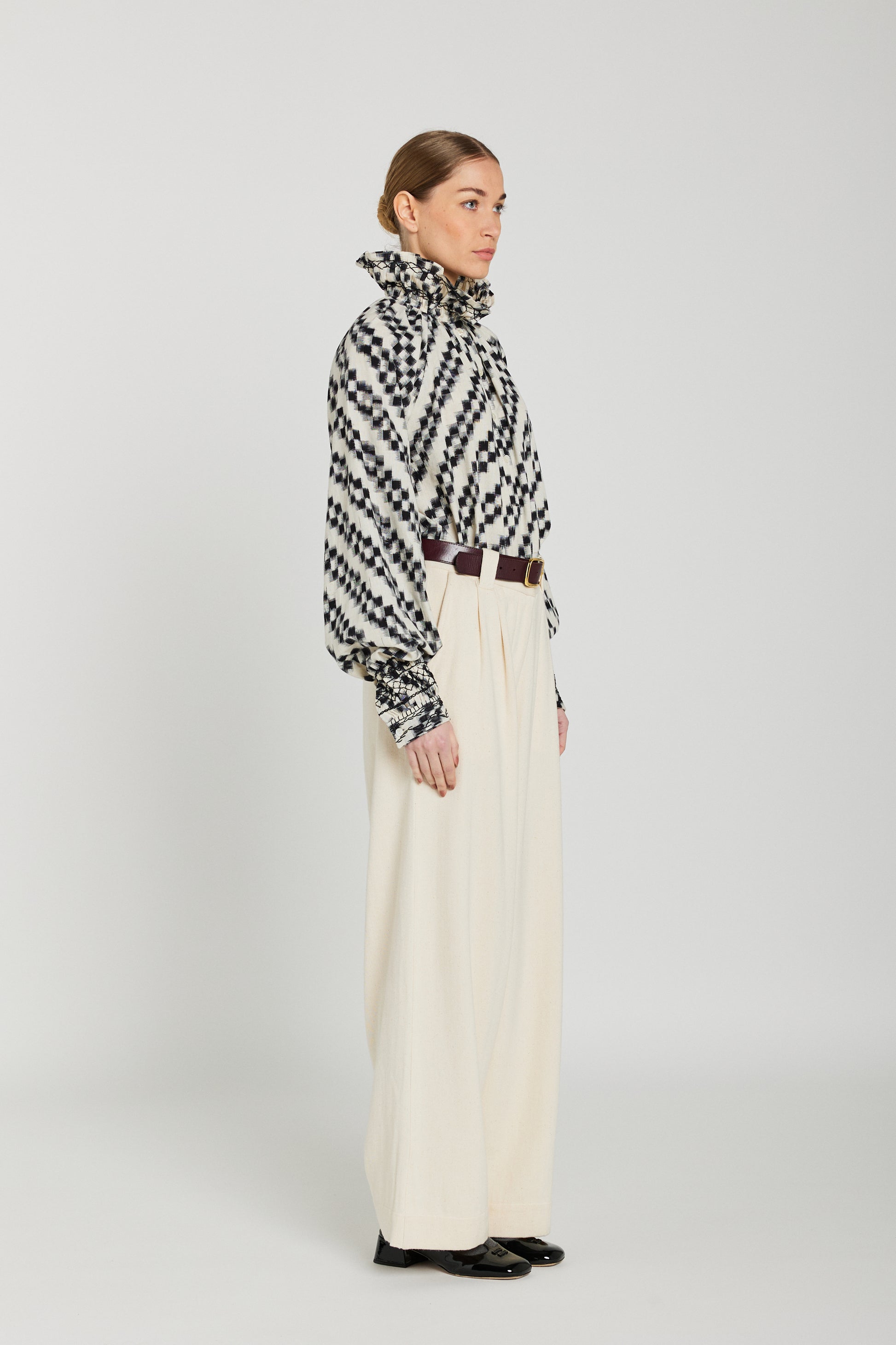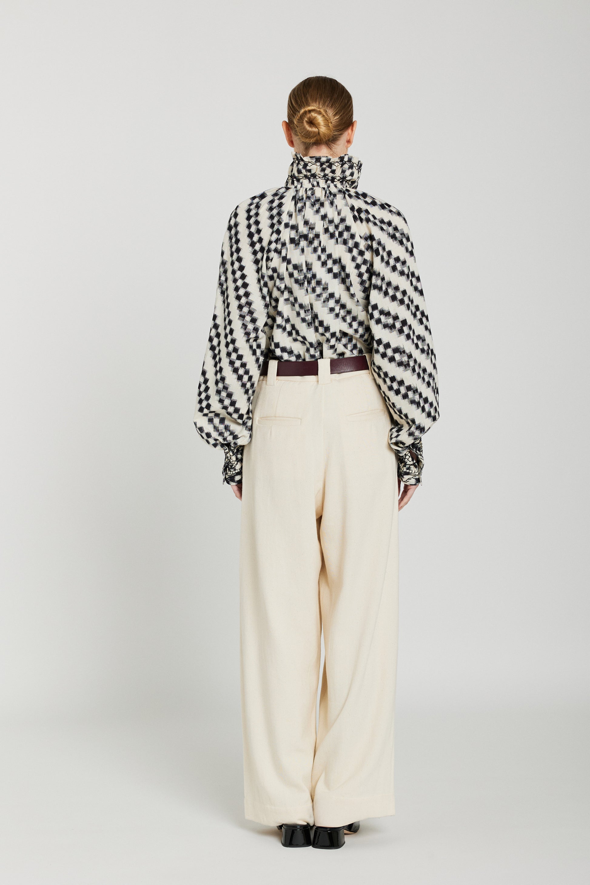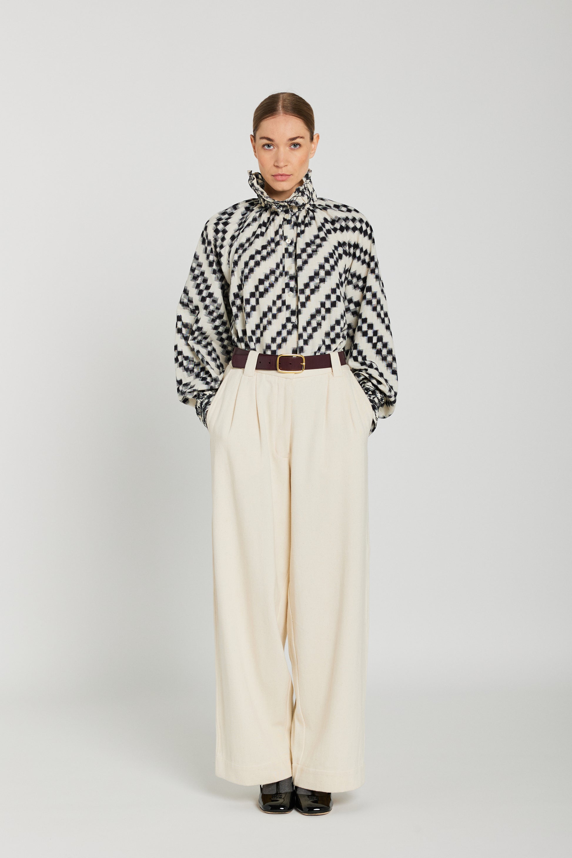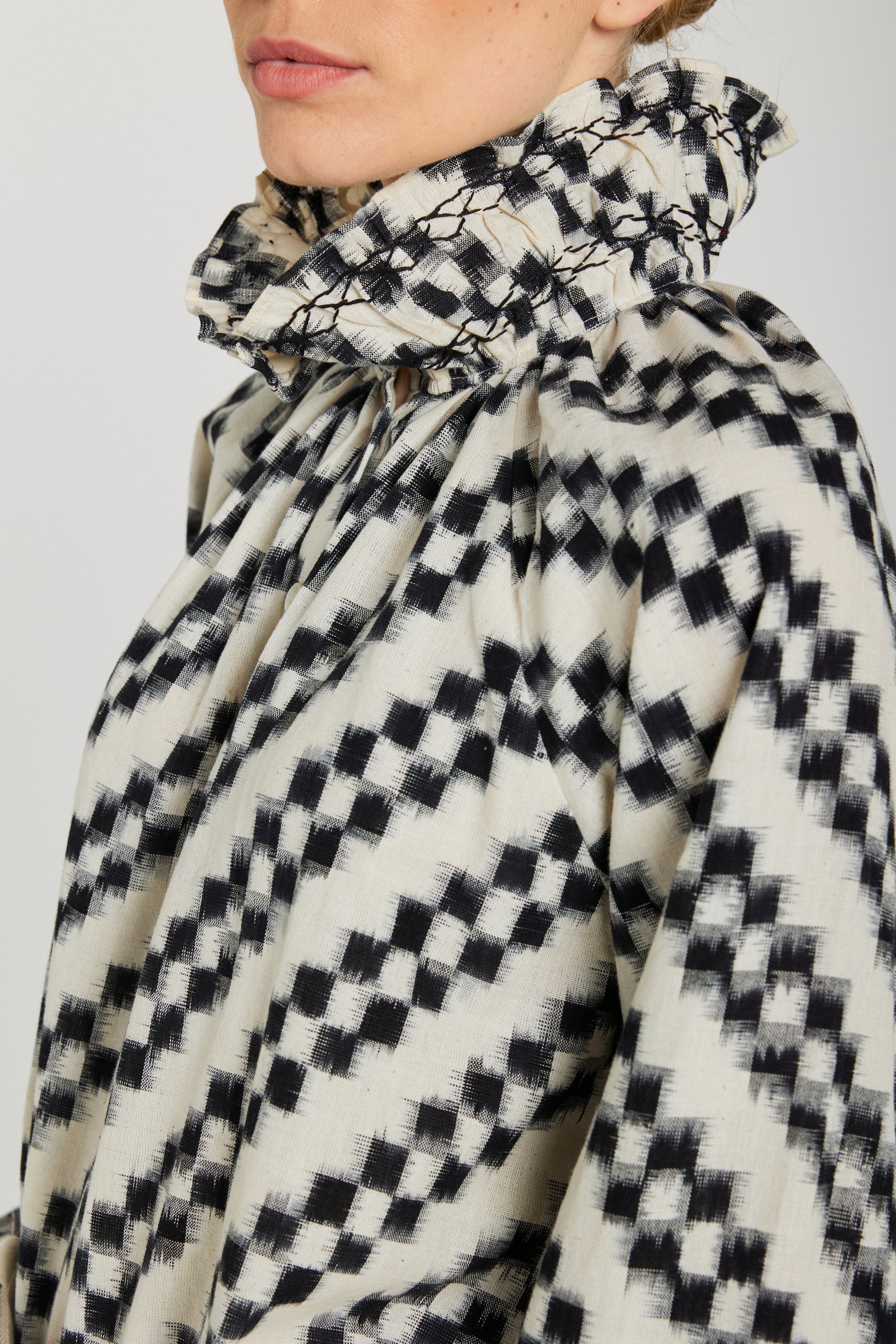 The ABRIL blouse in black and white ikat in organic cotton features a seductive gathered stand-up collar and puffed sleeves. A subtle play of contrasts creates a bold, feminine look, in the artisanal spirit of V de Vinster. Can be worn with a stand-up collar or open collar.