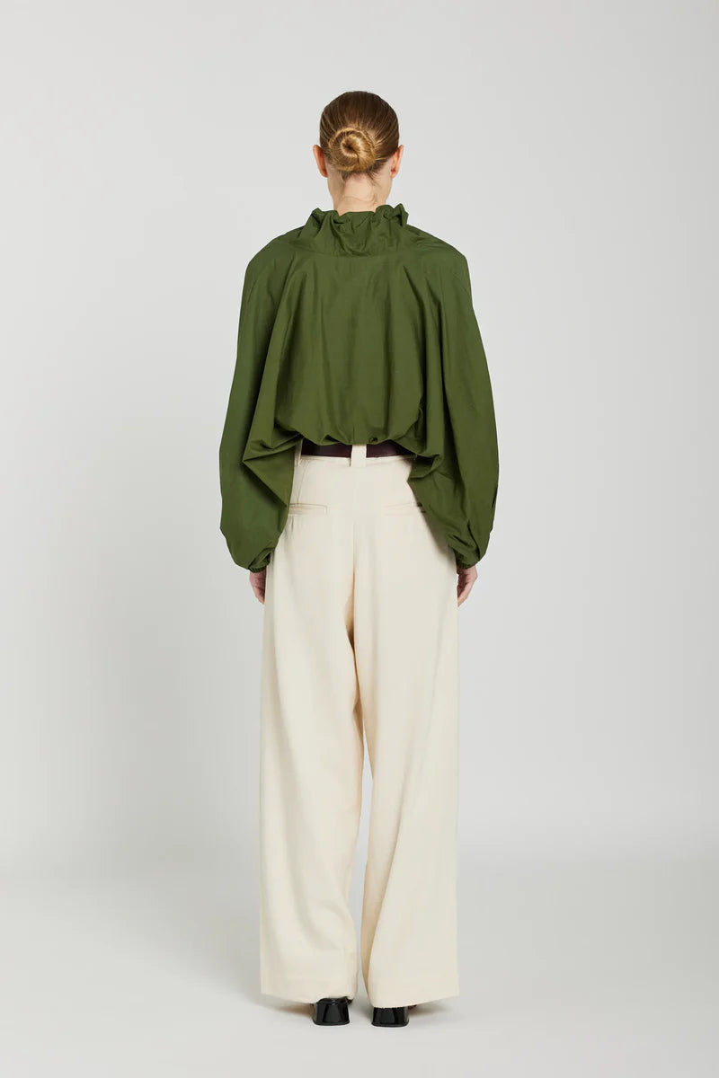 The Clara blouse made from organic cotton, features an adjustable gathered collar with two wide ties. Wear it with the collar closed and tied or open, depending on your mood.