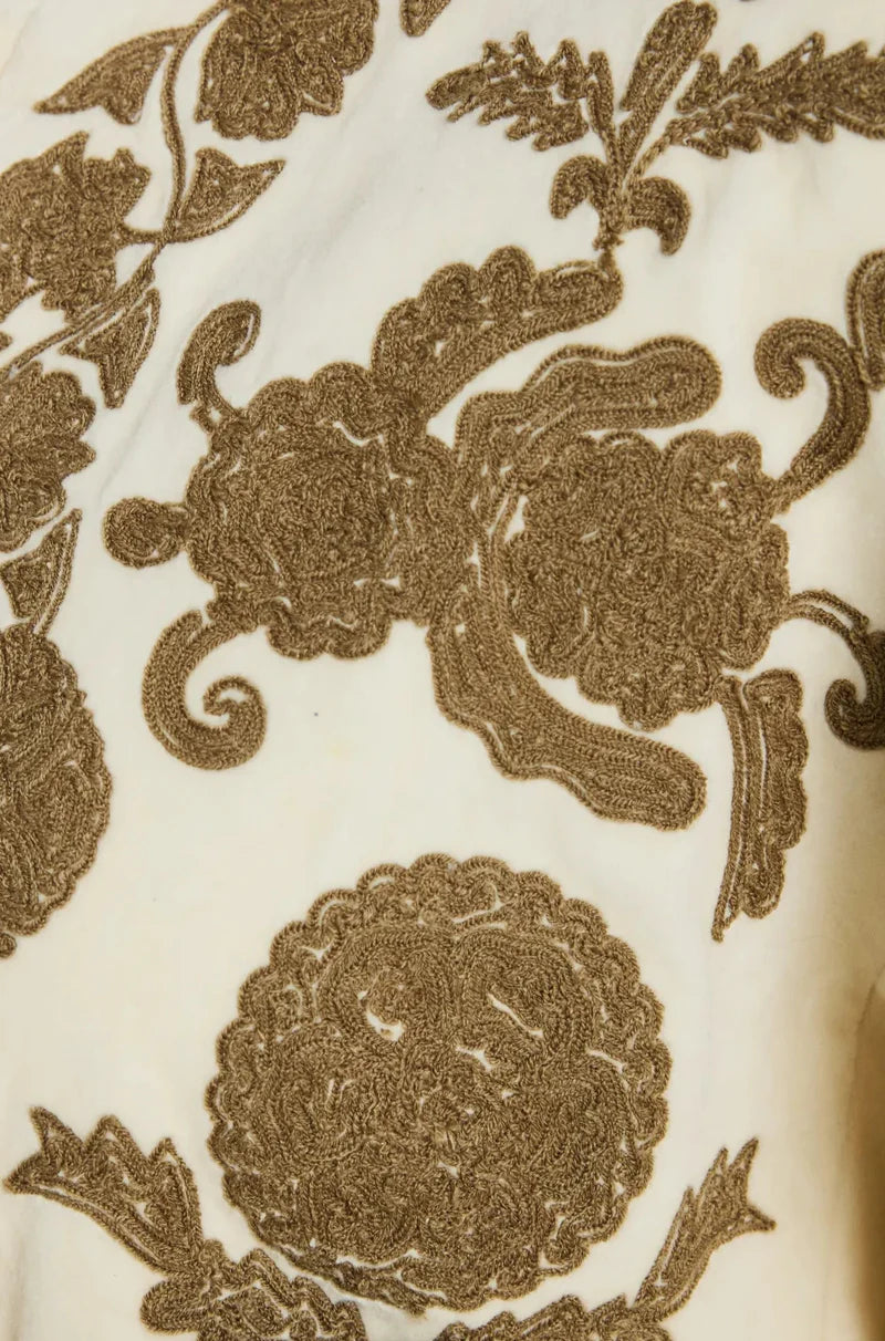 The CORALY bolero in cream velvet is adorned with taupe floral embroidery. A short and precious piece, perfect for warming up a flowing dress or dressing up a simple silhouette with poetry.