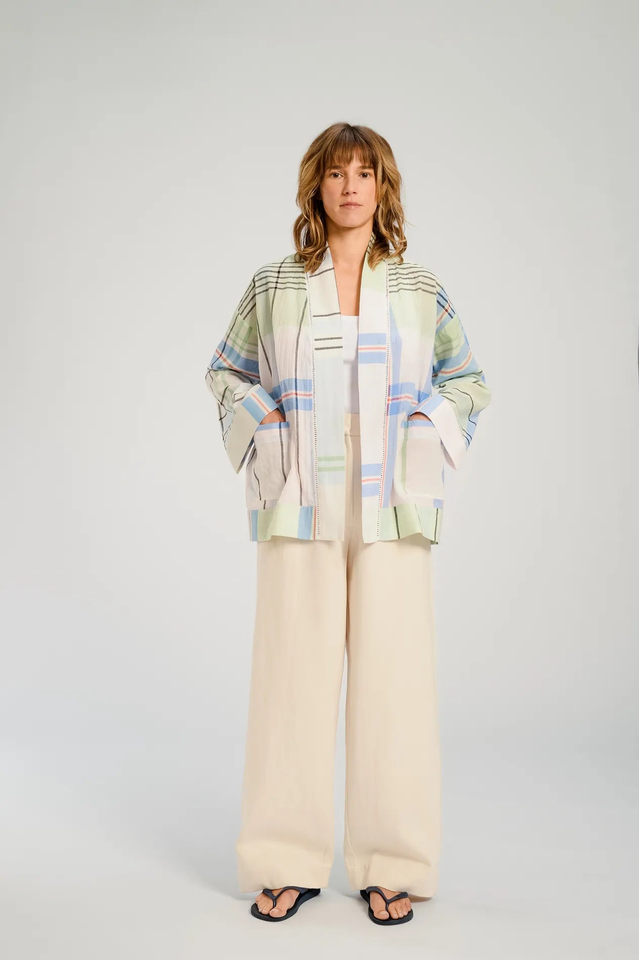 The Hokkaido kimono jacket is made from handwoven large check cotton in shades of blue. This pattern evokes a soft, fresh graphic composition, combining the precision of the design with the suppleness of the fabric.